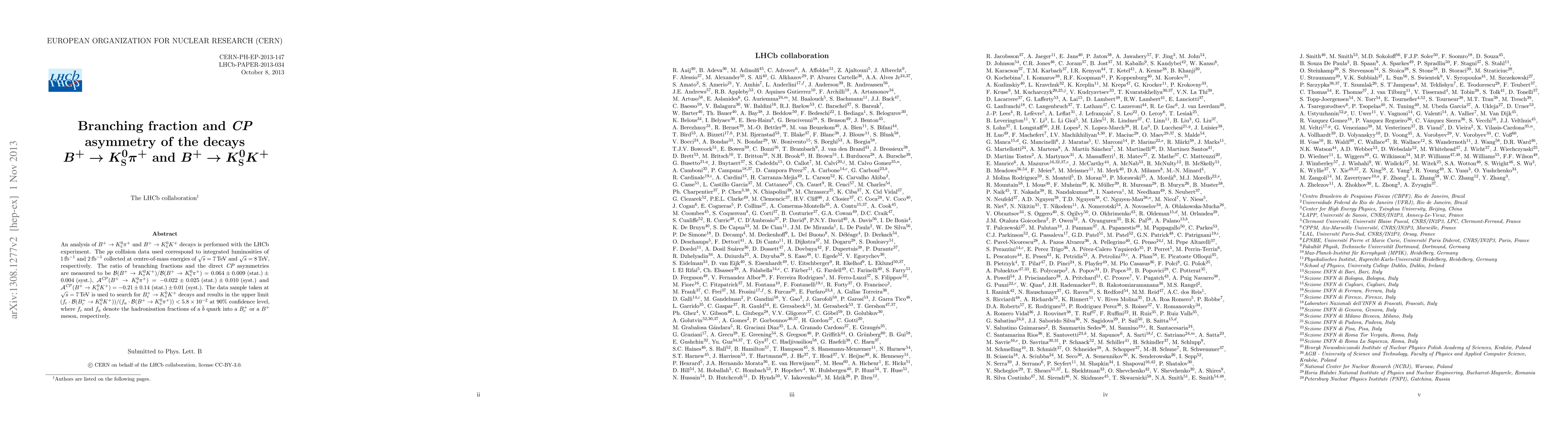 The LHCb experiment measures the branching fractions and CP asymmetries for $B^+ \to K_{\rm \scriptscriptstyle S}^0 \pi^+$ and $B^+ \to K_{\rm \scriptscriptstyle S}^0 K^+$ decays, finding a branching ratio ratio of 0.064 and CP asymmetries of -0.022 and -0.21. An upper limit is also set for $B_c^+ \to K_{\rm \scriptscriptstyle S}^0 K^+$ decays.