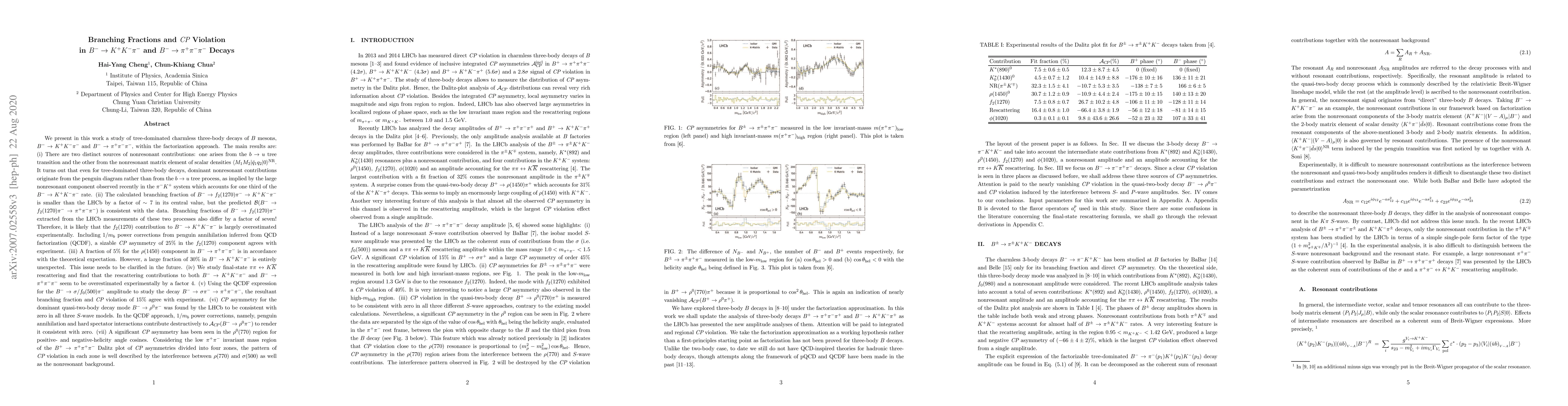This study investigates the branching fractions and CP violation in $B^-\to K^+K^-\pi^-$ and $B^-\to\pi^+\pi^-\pi^-$ decays, revealing significant nonresonant contributions from penguin diagrams rather than $b\to u$ transitions. The calculated branching fractions for $f_2(1270)$ decays differ substantially from LHCb measurements, suggesting an overestimation of its contribution to $B^-\to K^+K^-\pi^-$.