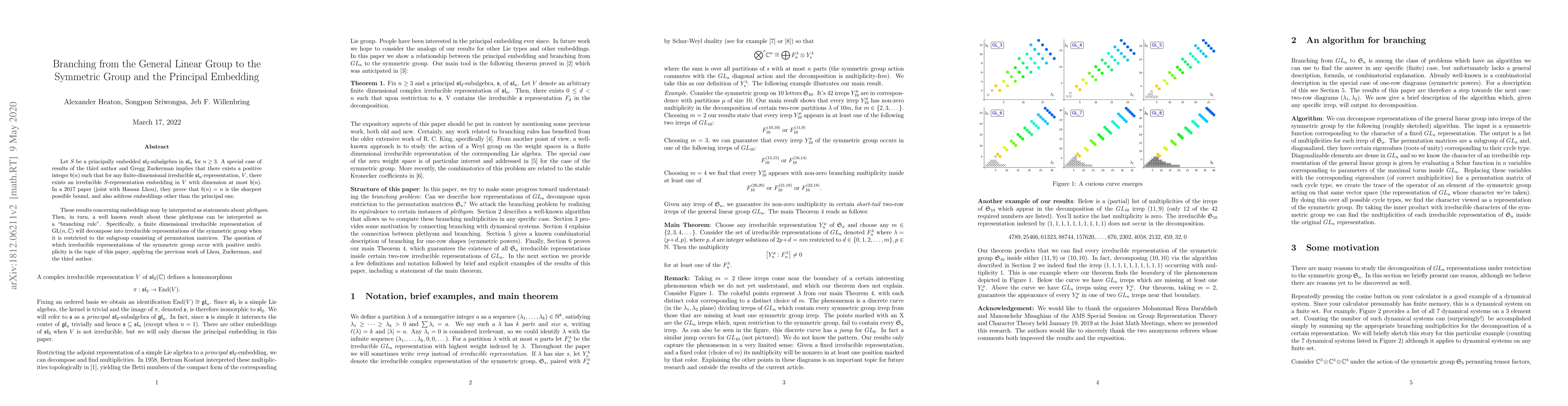 Let S be a principally embedded sl_2 subalgebra in sl_n for n > 2. A special case of results of the third author and Gregg Zuckerman implies that there exists a positive integer b(n) such that for any finite-dimensional irreducible sl_n representation, V, there exists an irreducible S-representation embedding in V with dimension at most b(n). In a 2017 paper (joint with Hassan Lhou), they prove that b(n)=n is the sharpest possible bound, and also address embeddings other than the principal one. These results concerning embeddings may by interpreted as statements about plethysm. Then, a well known result about these plethysms can be interpreted as a "branching rule". Specifically, a (finite dimensional) representation of GL(n,C) will decompose into irreducible representations of the symmetric group when it is restricted to the subgroup consisting of permutation matrices. The question of which irreducible representations of the symmetric group occur with positive multiplicity is the topic of this paper, applying the previous work of Lhou, Zuckerman, and the third author.