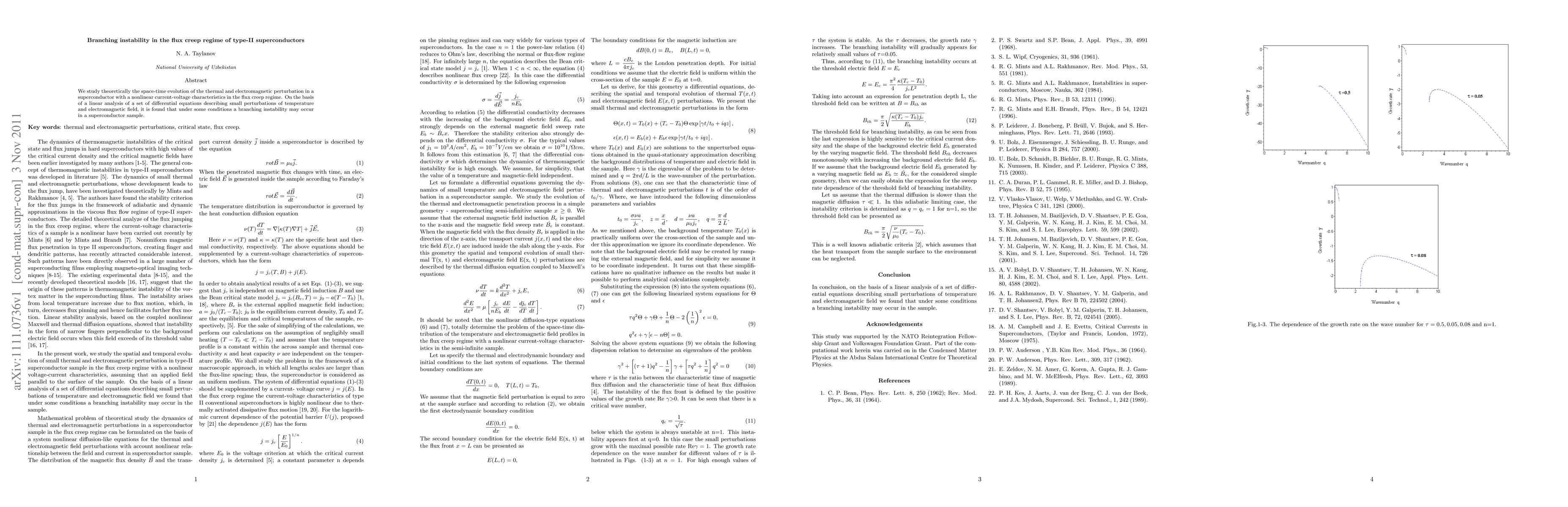 We study theoretically the space-time evolution of the thermal and electromagnetic perturbation in a superconductor with a nonlinear current-voltage characteristics in the flux creep regime. On the basis of a linear analysis of a set of differential equations describing small perturbations of temperature and electromagnetic field, it is found that under some conditions a branching instability may occur in a superconductor sample.