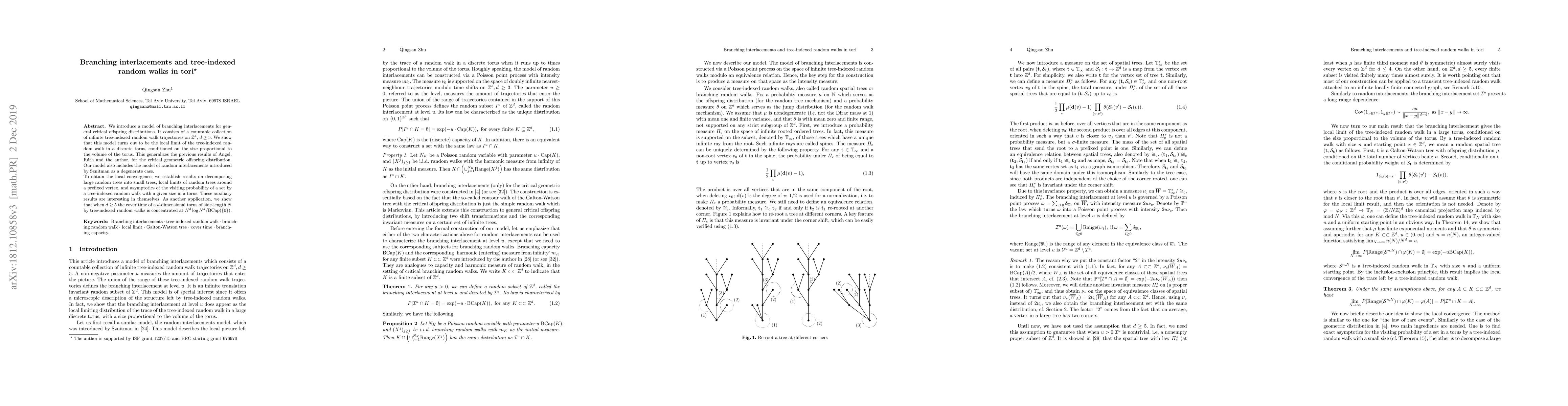 The paper introduces a branching interlacements model for critical offspring distributions, showing it converges locally to tree-indexed random walks in a toroidal setting. The model generalizes previous results and includes random interlacements as a special case, with implications for cover times in high-dimensional tori.
