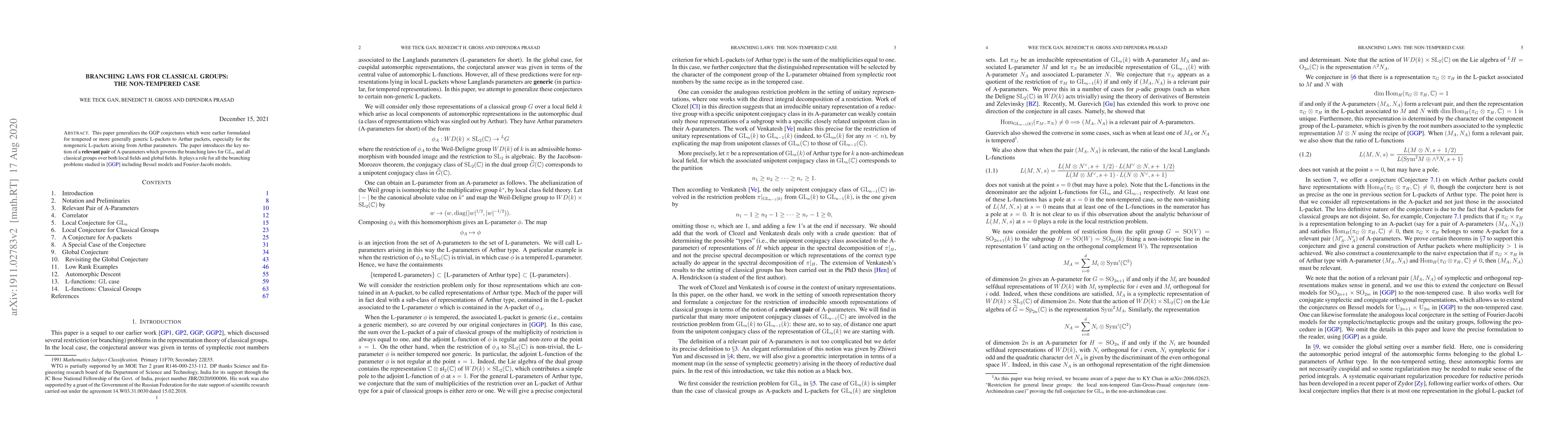 This paper generalizes branching laws for classical groups beyond tempered cases, introducing a key notion of relevant A-parameters that govern branching laws for GLn and classical groups over local and global fields.