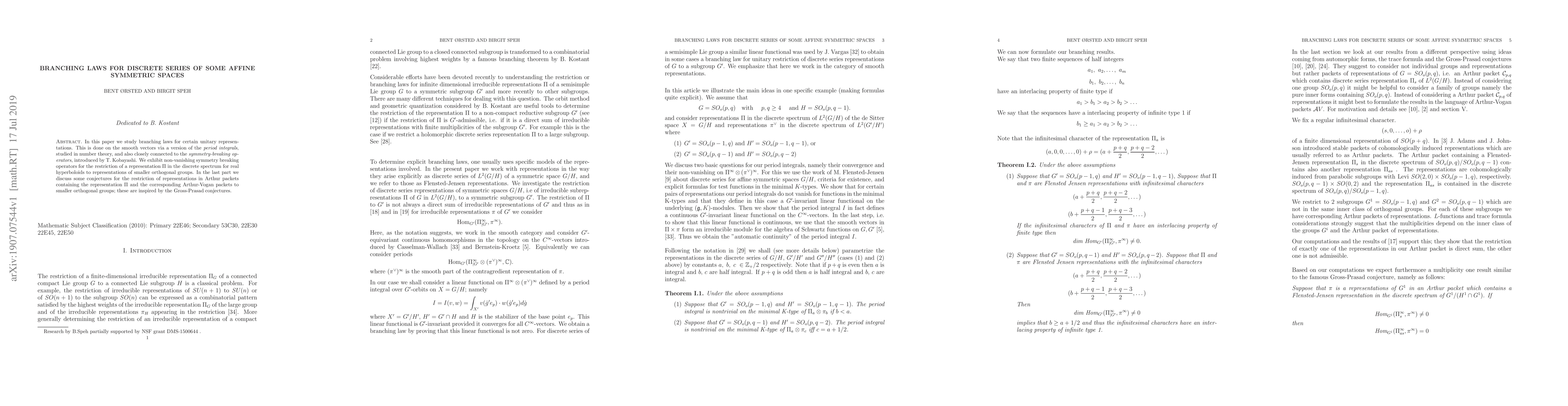 The approach combines techniques from number theory (period integrals) with representation theory, offering new insights into branching laws for discrete series representations in affine symmetric spaces.