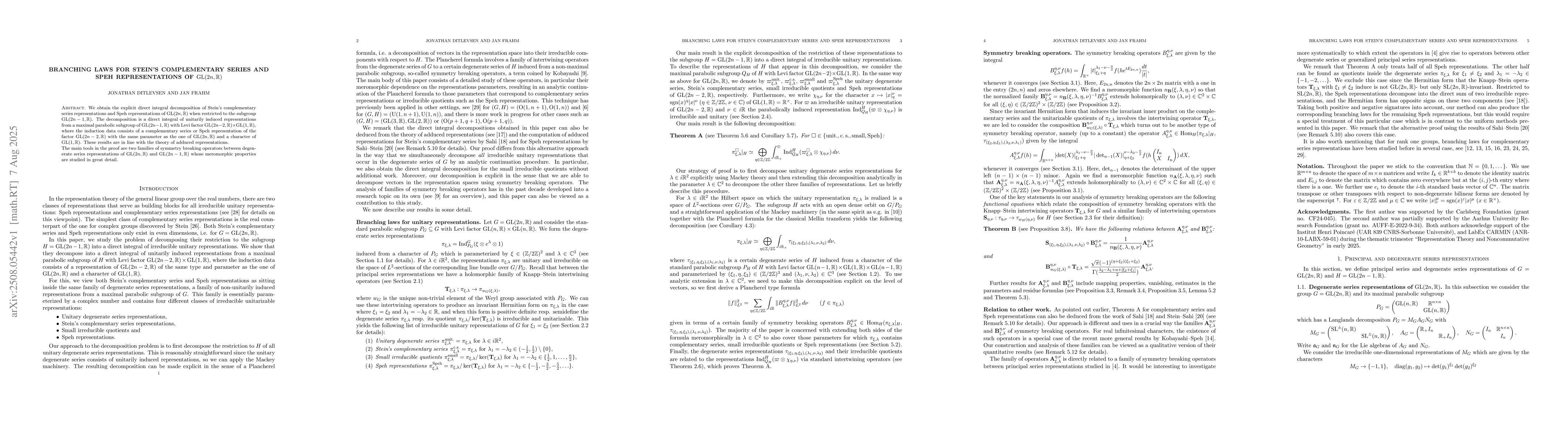 We obtain the explicit direct integral decomposition of Stein's complementary series representations and Speh representations of $\operatorname{GL}(2n,\mathbb{R})$ when restricted to the subgroup $\operatorname{GL}(2n-1, \mathbb{R})$. The decomposition is a direct integral of unitarily induced representations from a maximal parabolic subgroup of $\operatorname{GL}(2n-1, \mathbb{R})$ with Levi factor $\operatorname{GL}(2n-2, \mathbb{R})\times\operatorname{GL}(1, \mathbb{R})$, where the induction data consists of a complementary series or Speh representation of the factor $\operatorname{GL}(2n-2, \mathbb{R})$ with the same parameter as the one of $\operatorname{GL}(2n, \mathbb{R})$ and a character of $\operatorname{GL}(1, \mathbb{R})$. These results are in line with the theory of adduced representations. The main tools in the proof are two families of symmetry breaking operators between degenerate series representations of $\operatorname{GL}(2n, \mathbb{R})$ and $\operatorname{GL}(2n-1, \mathbb{R})$ whose meromorphic properties are studied in great detail.