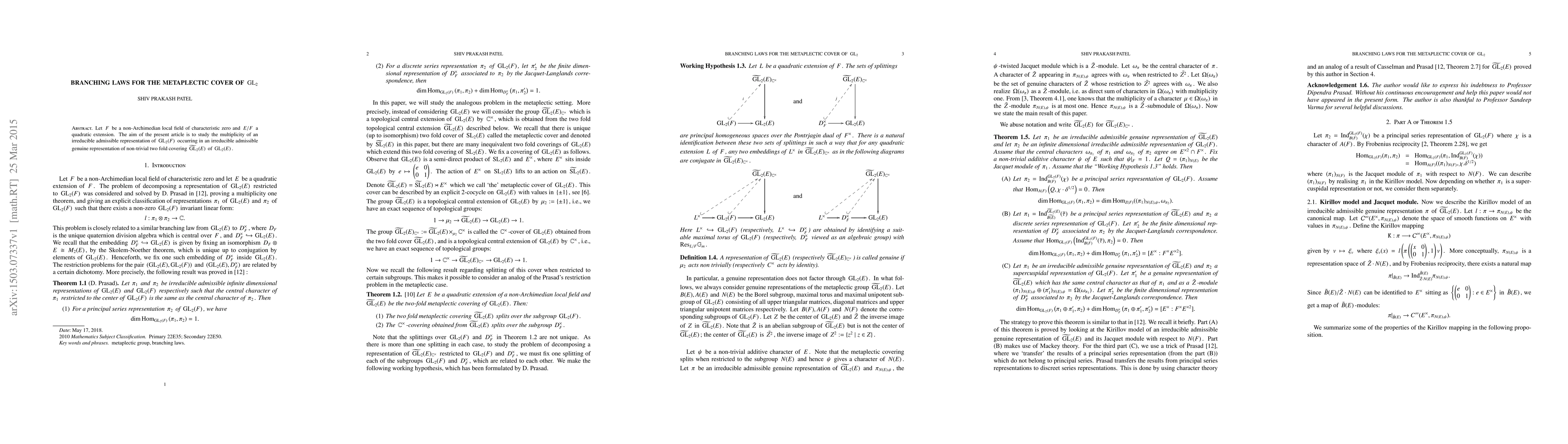 This paper investigates the branching laws for the metaplectic cover of ${\rm GL}_{2}$, determining the multiplicities of irreducible ${\rm GL}_2(F)$ representations within irreducible admissible genuine representations of $\widetilde{{\rm GL}}_2(E)$, a non-trivial two-fold covering of ${\rm GL}_2(E)$, over a non-Archimedian local field $F$ and its quadratic extension $E/F$.