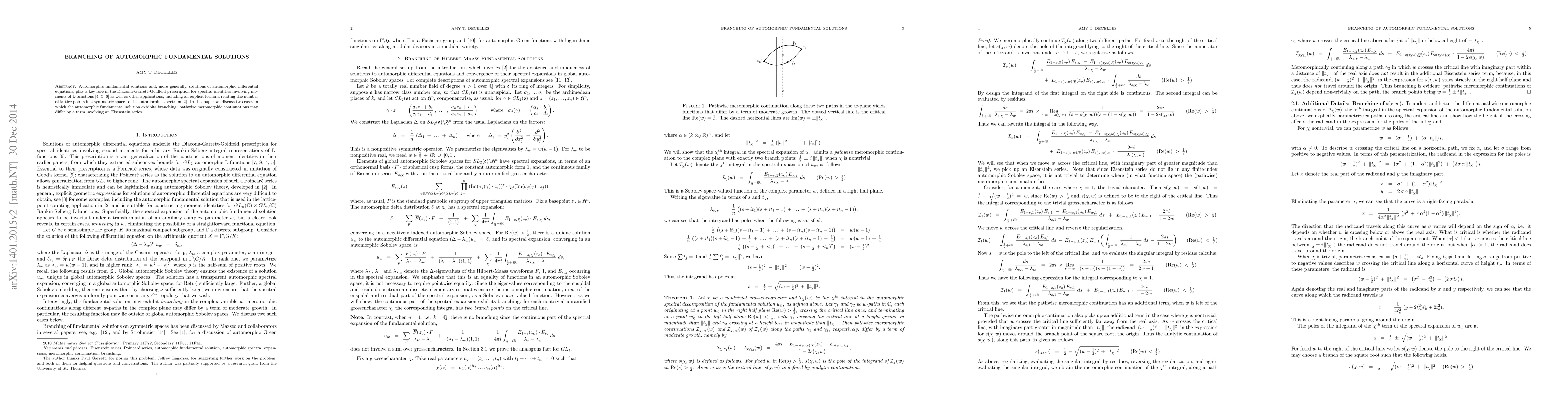 Automorphic fundamental solutions and, more generally, solutions of automorphic differential equations, play a key role in the Diaconu-Garrett-Goldfeld prescription for spectral identities involving moments of L-functions as well as other applications, including an explicit formula relating the number of lattice points in a symmetric space to the automorphic spectrum. In this paper we discuss two cases in which the automorphic fundamental solution exhibits branching: pathwise meromorphic continuations may differ by a term involving an Eisenstein series.