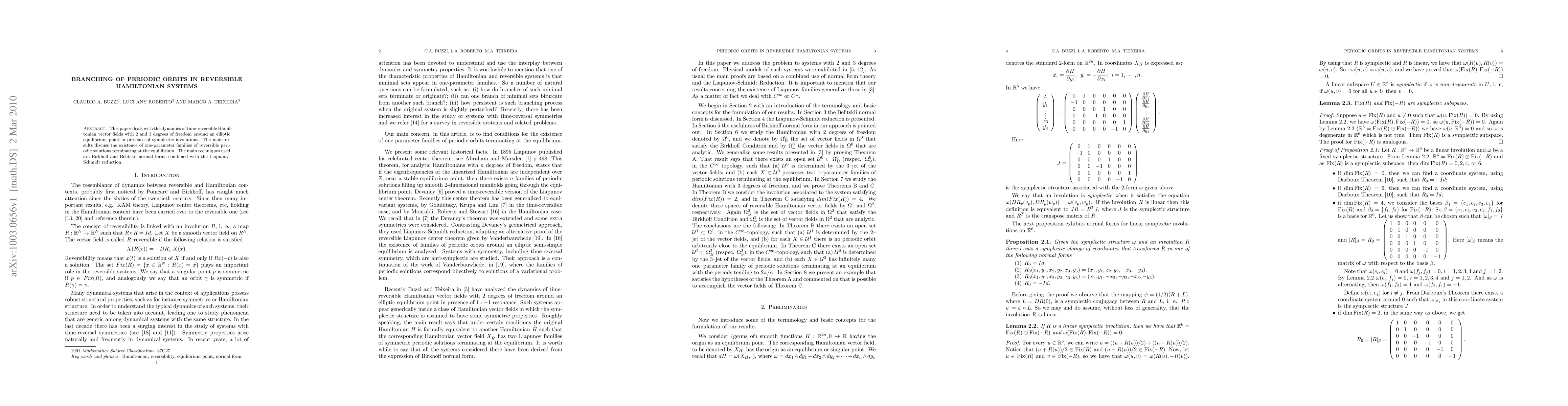 This paper deals with the dynamics of time-reversible Hamiltonian vector fields with 2 and 3 degrees of freedom around an elliptic equilibrium point in presence of symplectic involutions. The main results discuss the existence of one-parameter families of reversible periodic solutions terminating at the equilibrium. The main techniques used are Birkhoff and Belitskii normal forms combined with the Liapunov-Schmidt reduction.