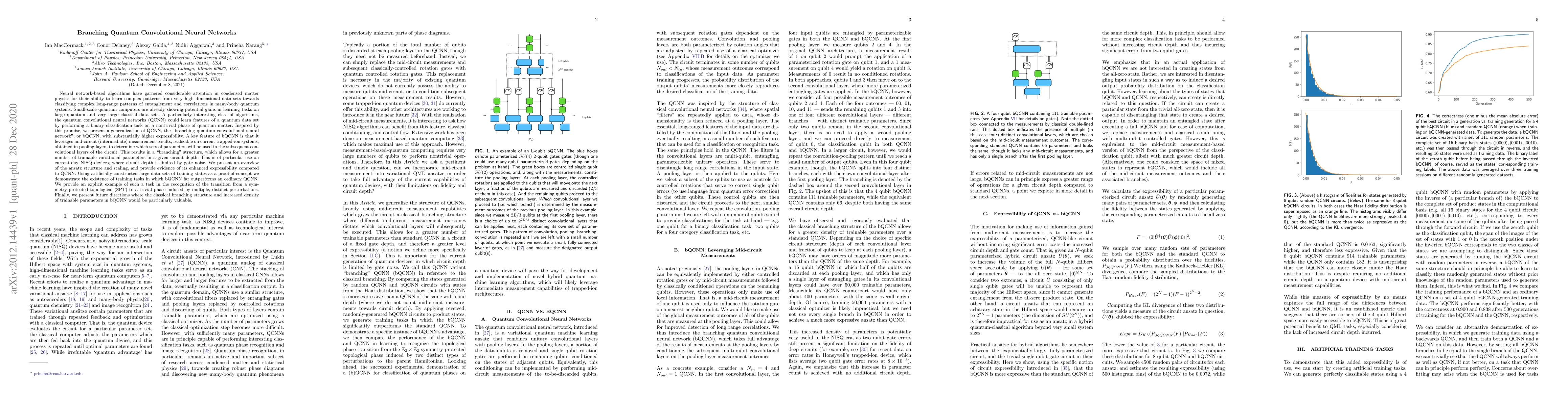 Neural network-based algorithms have garnered considerable attention in condensed matter physics for their ability to learn complex patterns from very high dimensional data sets towards classifying complex long-range patterns of entanglement and correlations in many-body quantum systems. Small-scale quantum computers are already showing potential gains in learning tasks on large quantum and very large classical data sets. A particularly interesting class of algorithms, the quantum convolutional neural networks (QCNN) could learn features of a quantum data set by performing a binary classification task on a nontrivial phase of quantum matter. Inspired by this promise, we present a generalization of QCNN, the branching quantum convolutional neural network, or bQCNN, with substantially higher expressibility. A key feature of bQCNN is that it leverages mid-circuit (intermediate) measurement results, realizable on current trapped-ion systems, obtained in pooling layers to determine which sets of parameters will be used in the subsequent convolutional layers of the circuit. This results in a branching structure, which allows for a greater number of trainable variational parameters in a given circuit depth. This is of particular use on current-day NISQ devices, where circuit depth is limited by gate noise. We present an overview of the ansatz structure and scaling, and provide evidence of its enhanced expressibility compared to QCNN. Using artificially-constructed large data sets of training states as a proof-of-concept we demonstrate the existence of training tasks in which bQCNN far outperforms an ordinary QCNN. Finally, we present future directions where the classical branching structure and increased density of trainable parameters in bQCNN would be particularly valuable.