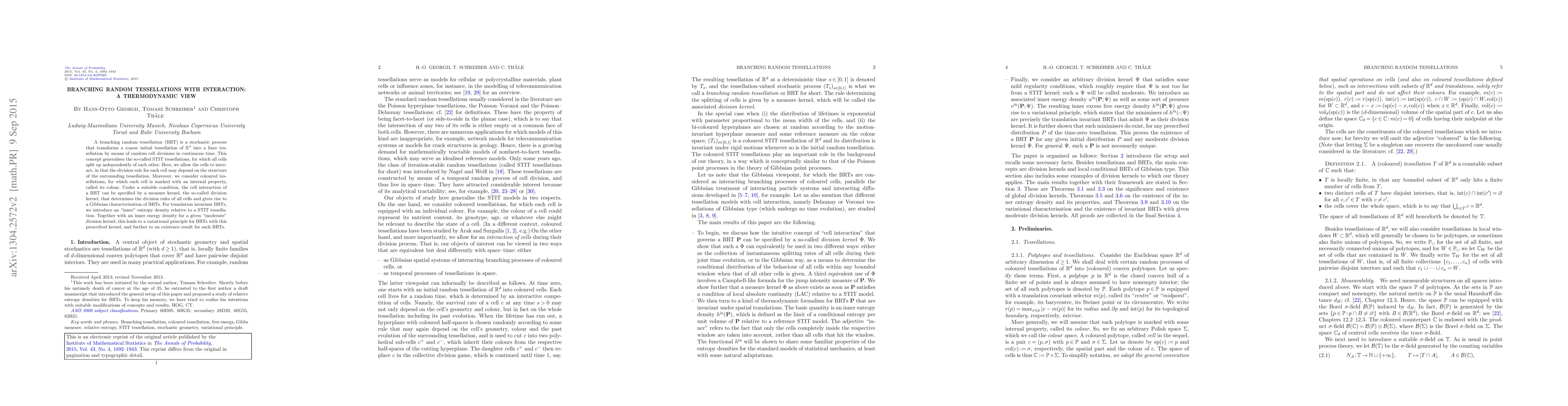 A branching random tessellation (BRT) is a stochastic process that transforms a coarse initial tessellation of $\mathbb{R}^d$ into a finer tessellation by means of random cell divisions in continuous time. This concept generalises the so-called STIT tessellations, for which all cells split up independently of each other. Here, we allow the cells to interact, in that the division rule for each cell may depend on the structure of the surrounding tessellation. Moreover, we consider coloured tessellations, for which each cell is marked with an internal property, called its colour. Under a suitable condition, the cell interaction of a BRT can be specified by a measure kernel, the so-called division kernel, that determines the division rules of all cells and gives rise to a Gibbsian characterisation of BRTs. For translation invariant BRTs, we introduce an "inner" entropy density relative to a STIT tessellation. Together with an inner energy density for a given "moderate" division kernel, this leads to a variational principle for BRTs with this prescribed kernel, and further to an existence result for such BRTs.