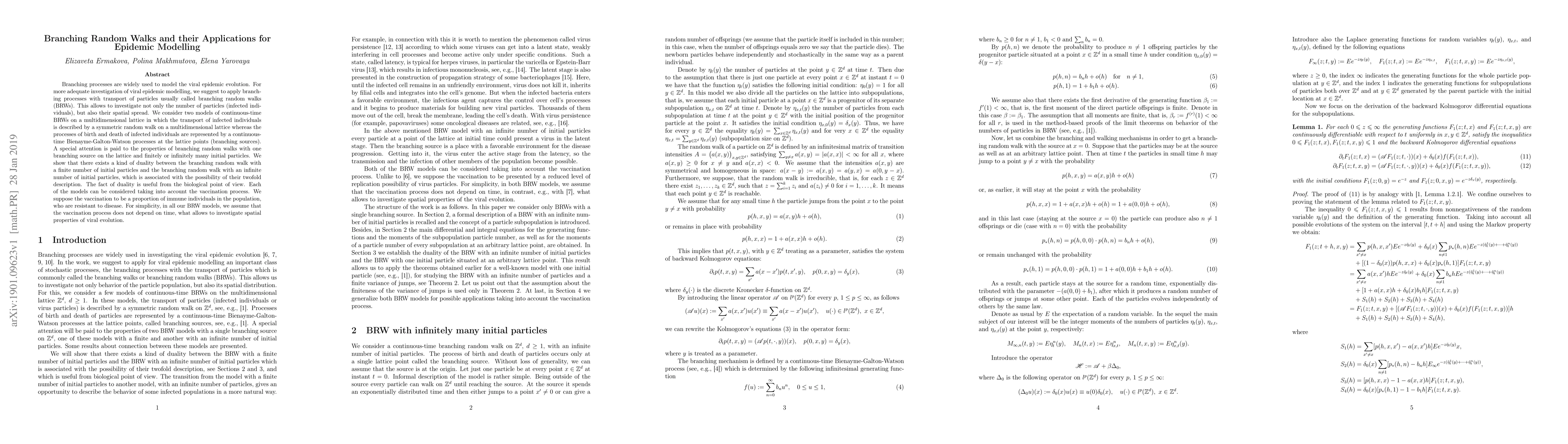 Branching processes are widely used to model the viral epidemic evolution. For more adequate investigation of viral epidemic modelling, we suggest to apply branching processes with transport of particles usually called branching random walks (BRWs). This allows to investigate not only the number of particles (infected individuals), but also their spatial spread. We consider two models of continuous-time BRWs on a multidimensional lattice in which the transport of infected individuals is described by a symmetric random walk on a multidimensional lattice whereas the processes of birth and death of infected individuals are represented by a continuous-time Bienayme-Galton-Watson processes at the lattice points (branching sources). A special attention is paid to the properties of branching random walks with one branching source on the lattice and finitely or infinitely many initial particles. We show that there exists a kind of duality between the branching random walk with a finite number of initial particles and the branching random walk with an infinite number of initial particles, which is associated with the possibility of their twofold description. The fact of duality is useful from the biological point of view. Each of the models can be considered taking into account the vaccination process. We suppose the vaccination to be a proportion of immune individuals in the population, who are resistant to disease. For simplicity, in all our BRW models, we assume that the vaccination process does not depend on time, what allows to investigate spatial properties of viral evolution.