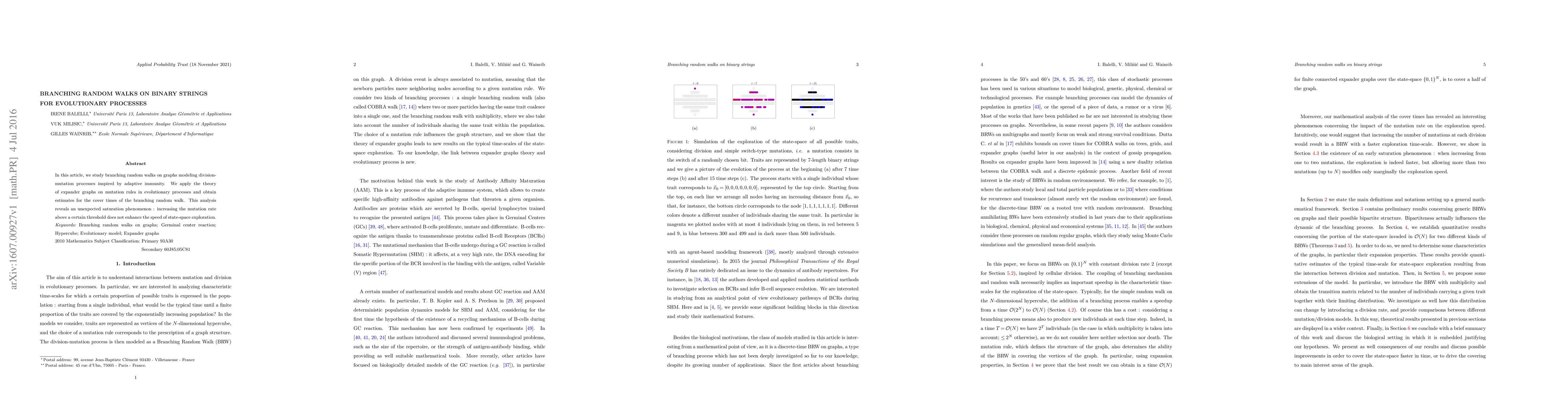 This paper investigates branching random walks on binary string graphs to model adaptive immunity's division-mutation processes, leveraging expander graph theory. It finds that beyond a mutation rate threshold, increasing the rate no longer improves the speed of state-space exploration, revealing a saturation phenomenon.