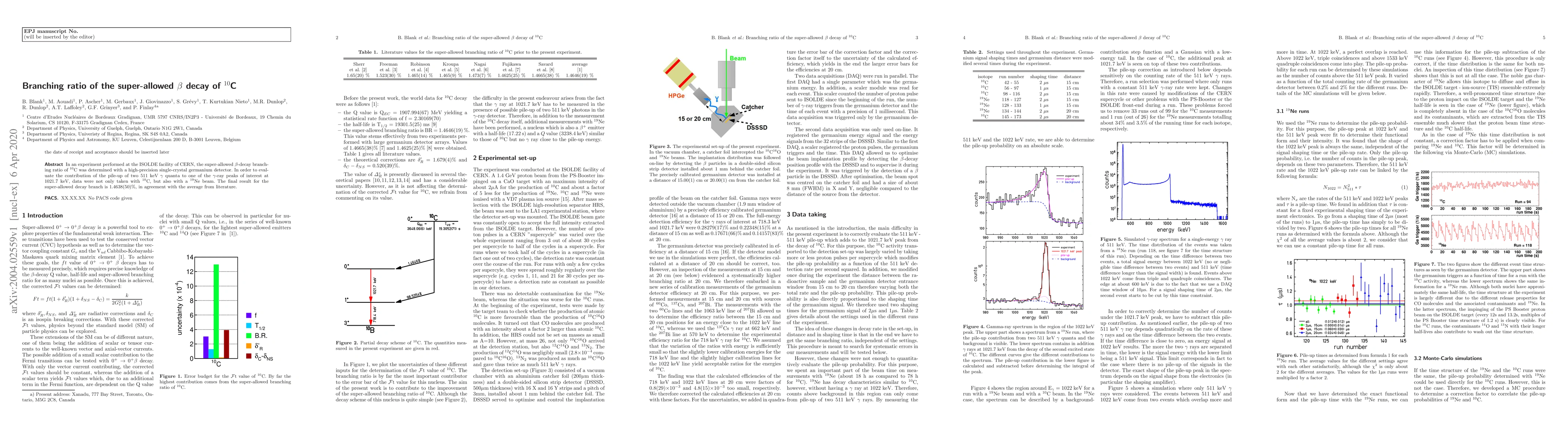 In an experiment performed at the ISOLDE facility of CERN, the super-allowed beta-decay branching ratio of 10C was determined with a high-precision single-crystal germanium detector. In order to evaluate the contribution of the pile-up of two 511 keV gamma quanta to one of the gamma-ray peaks of interest at 1021.7 keV, data were not only taken with 10C, but also with a 19Ne beam. The final result for the super-allowed decay branch is 1.4638(50)%, in agreement with the average from literature.
