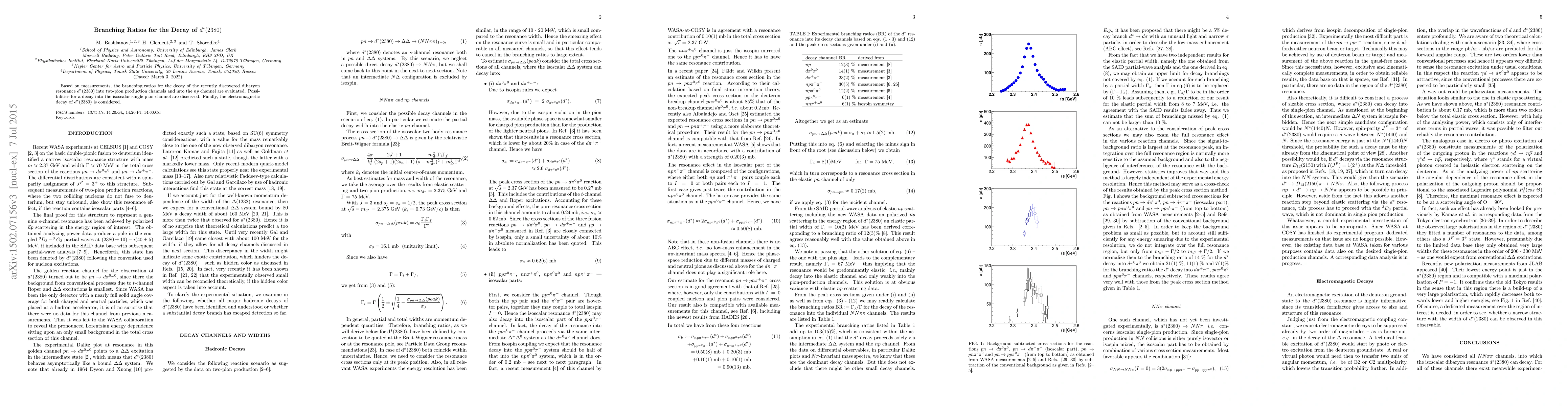 The paper presents measurements of branching ratios for the decay of the dibaryon resonance d*(2380) into two-pion and np channels. It also discusses potential decay into a single isoscalar pion channel and considers the electromagnetic decay of d*(2380).