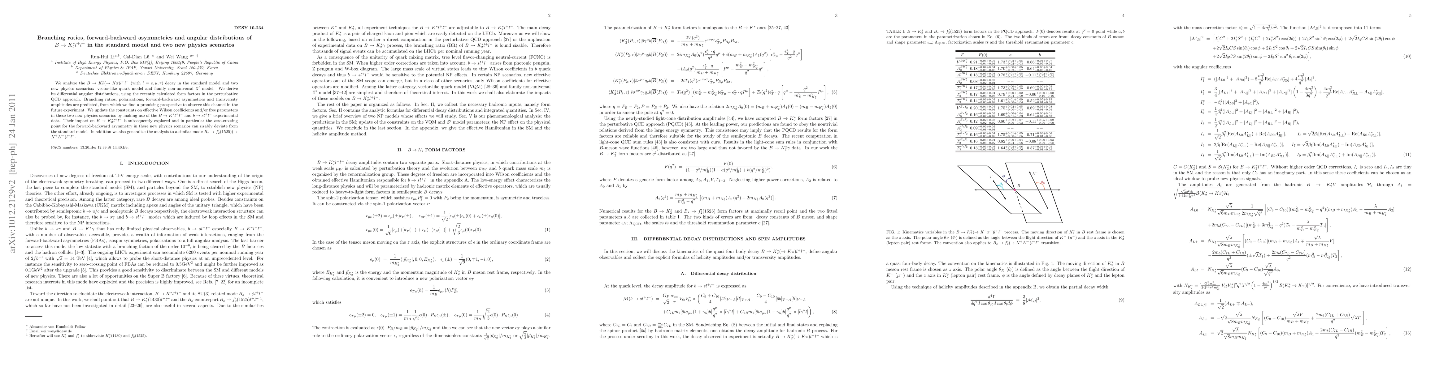 This paper investigates the decay $B\to K_2^*l^+l^-$ in the Standard Model and two new physics scenarios, predicting branching ratios, asymmetries, and angular distributions. It finds potential for future experimental observation and explores deviations in forward-backward asymmetries from Standard Model predictions.