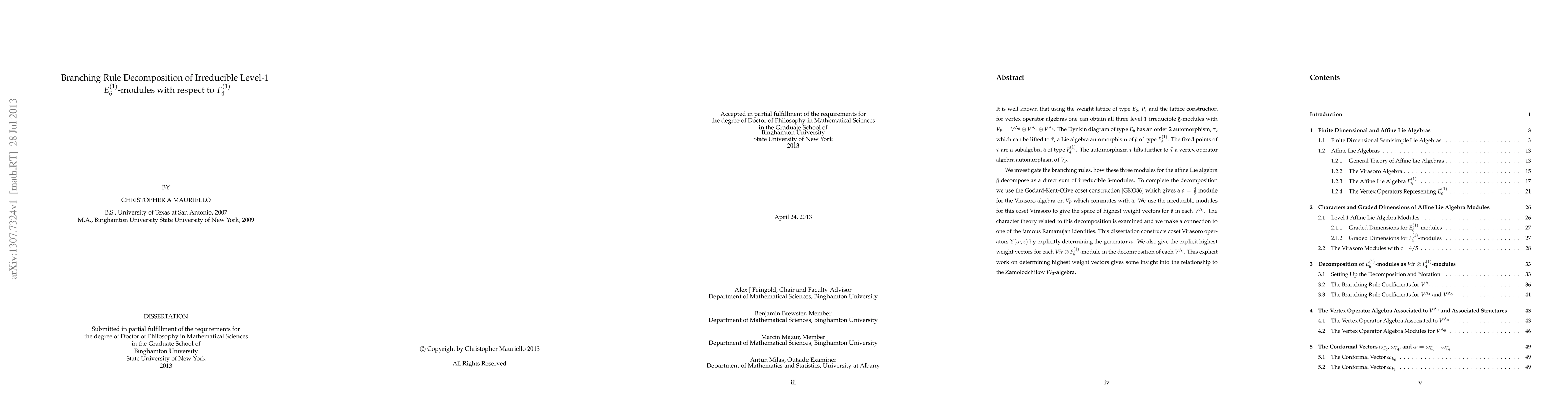 It is well known that using the weight lattice of type $E_6$, $P$, and the lattice construction for vertex operator algebras one can obtain all three level 1 irreducible $\tilde{g}$-modules with $V_P = V^{\Lamba_0} \oplus V^{\Lamba_1} \oplus V^{\Lamba_6}$. The Dynkin diagram of type $E_6$ has an order 2 automorphism, $\tau$, which can be lifted to $\tilde{{\tau}}$, a Lie algebra automorphism of $\tilde{g}$ of type $E_6^(1)$. The fixed points of $\tilde{{\tau}}$ are a subalgebra $\tilde{a}$ of type $F_4^(1)$. The automorphism $\tau$ lifts further to $\hat{{\tau}}$ a vertex operator algebra automorphism of $V_P$. We investigate the branching rules, how these three modules for the affine Lie algebra $\tilde{g}$ decompose as a direct sum of irreducible $\tilde{a}$-modules. To complete the decomposition we use the Godard-Kent-Olive coset construction which gives a $c = \frac{4}{5}$ module for the Virasoro algebra on $V_P$ which commutes with $\tilde{a}$. We use the irreducible modules for this coset Virasoro to give the space of highest weight vectors for $\tilde{a}$ in each $V^{\Lamba_i}$. The character theory related to this decomposition is examined and we make a connection to one of the famous Ramanujan identities. This dissertation constructs coset Virasoro operators $Y(\omg,z)$ by explicitly determining the generator $\omg$. We also give the explicit highest weight vectors for each $Vir \otimes F_4^(1)$-module in the decomposition of each $V^{\Lamba_i}$. This explicit work on determining highest weight vectors gives some insight into the relationship to the Zamolodchikov $W_3$-algebra.
