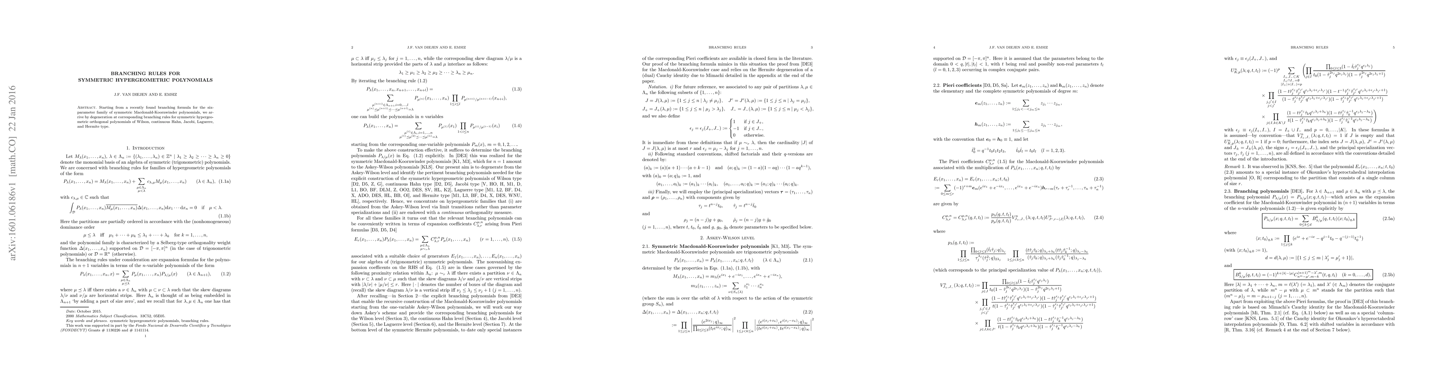 This paper provides branching rules for six types of symmetric hypergeometric orthogonal polynomials, building on a recent formula for Macdonald-Koornwinder polynomials.