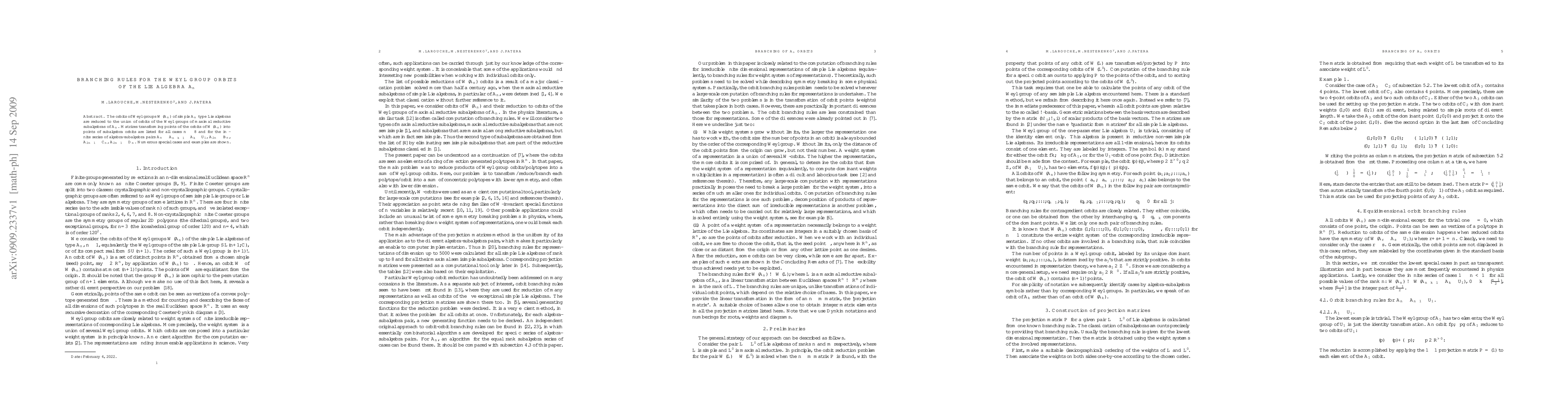 The orbits of Weyl groups W(A(n)) of simple A(n) type Lie algebras are reduced to the union of orbits of the Weyl groups of maximal reductive subalgebras of A(n). Matrices transforming points of the orbits of W(An) into points of subalgebra orbits are listed for all cases n<=8 and for the infinite series of algebra-subalgebra pairs A(n) - A(n-k-1) x A(k) x U(1), A(2n) - B(n), A(2n-1) - C(n), A(2n-1) - D(n). Numerous special cases and examples are shown.