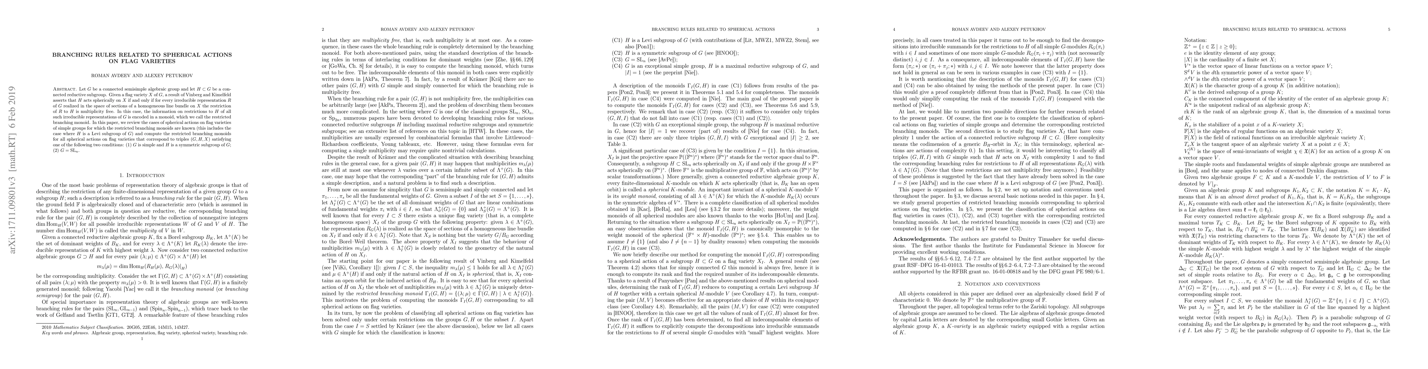 Let $G$ be a connected semisimple algebraic group and let $H \subset G$ be a connected reductive subgroup. Given a flag variety $X$ of $G$, a result of Vinberg and Kimelfeld asserts that $H$ acts spherically on $X$ if and only if for every irreducible representation $R$ of $G$ realized in the space of sections of a homogeneous line bundle on $X$ the restriction of $R$ to $H$ is multiplicity free. In this case, the information on restrictions to $H$ of all such irreducible representations of $G$ is encoded in a monoid, which we call the restricted branching monoid. In this paper, we review the cases of spherical actions on flag varieties of simple groups for which the restricted branching monoids are known (this includes the case where $H$ is a Levi subgroup of $G$) and compute the restricted branching monoids for all spherical actions on flag varieties that correspond to triples $(G,H,X)$ satisfying one of the following two conditions: (1) $G$ is simple and $H$ is a symmetric subgroup of $G$; (2) $G = \mathrm{SL}_n$.