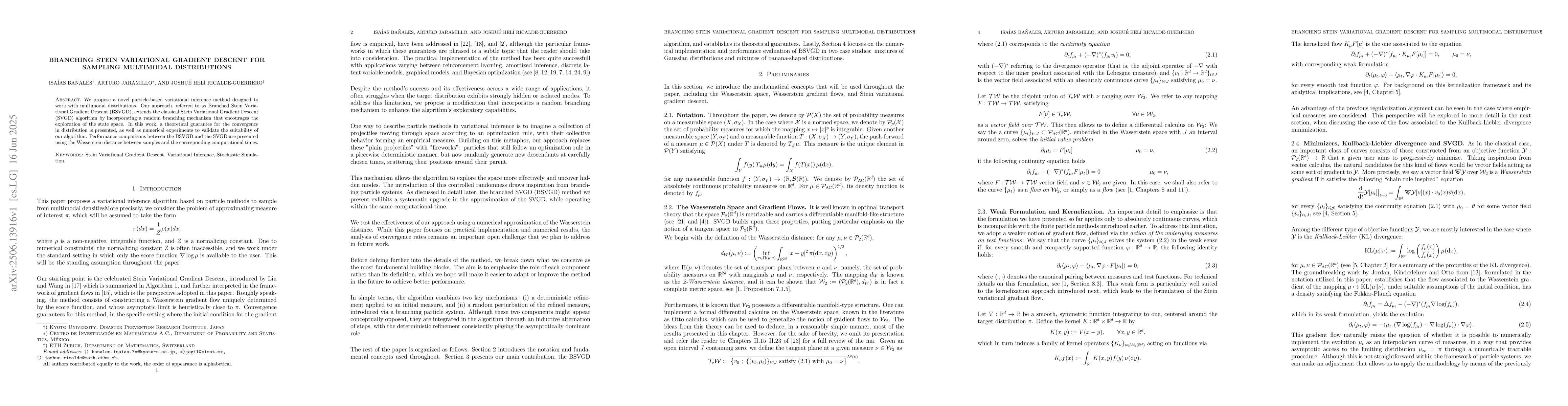 We propose a novel particle-based variational inference method designed to work with multimodal distributions. Our approach, referred to as Branched Stein Variational Gradient Descent (BSVGD), extends the classical Stein Variational Gradient Descent (SVGD) algorithm by incorporating a random branching mechanism that encourages the exploration of the state space. In this work, a theoretical guarantee for the convergence in distribution is presented, as well as numerical experiments to validate the suitability of our algorithm. Performance comparisons between the BSVGD and the SVGD are presented using the Wasserstein distance between samples and the corresponding computational times.
