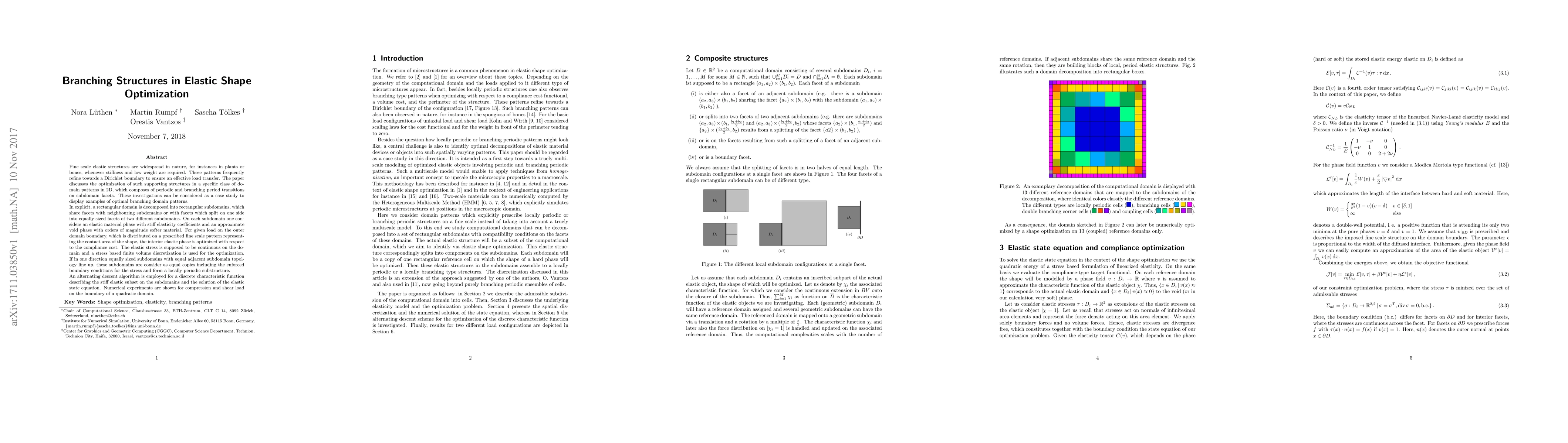 Fine scale elastic structures are widespread in nature, for instances in plants or bones, whenever stiffness and low weight are required. These patterns frequently refine towards a Dirichlet boundary to ensure an effective load transfer. The paper discusses the optimization of such supporting structures in a specific class of domain patterns in 2D, which composes of periodic and branching period transitions on subdomain facets. These investigations can be considered as a case study to display examples of optimal branching domain patterns. In explicit, a rectangular domain is decomposed into rectangular subdomains, which share facets with neighbouring subdomains or with facets which split on one side into equally sized facets of two different subdomains. On each subdomain one considers an elastic material phase with stiff elasticity coefficients and an approximate void phase with orders of magnitude softer material. For given load on the outer domain boundary, which is distributed on a prescribed fine scale pattern representing the contact area of the shape, the interior elastic phase is optimized with respect to the compliance cost. The elastic stress is supposed to be continuous on the domain and a stress based finite volume discretization is used for the optimization. If in one direction equally sized subdomains with equal adjacent subdomain topology line up, these subdomains are consider as equal copies including the enforced boundary conditions for the stress and form a locally periodic substructure. An alternating descent algorithm is employed for a discrete characteristic function describing the stiff elastic subset on the subdomains and the solution of the elastic state equation. Numerical experiments are shown for compression and shear load on the boundary of a quadratic domain.