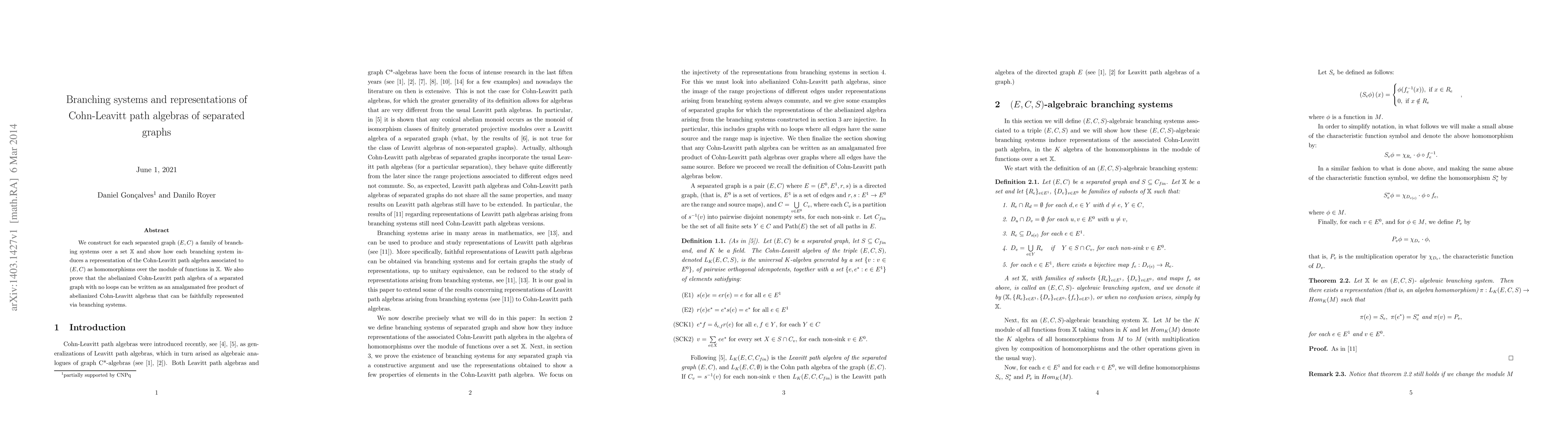 We construct for each separated graph (E;C) a family of branching systems over a set X and show how each branching system induces a representation of the Cohn-Leavitt path algebra associated to (E;C) as homomorphisms over the module of functions in X. We also prove that the abelianized Cohn-Leavitt path algebra of a separated graph with no loops can be written as an amalgamated free product of abelianized Cohn-Leavitt algebras that can be faithfully represented via branching systems.