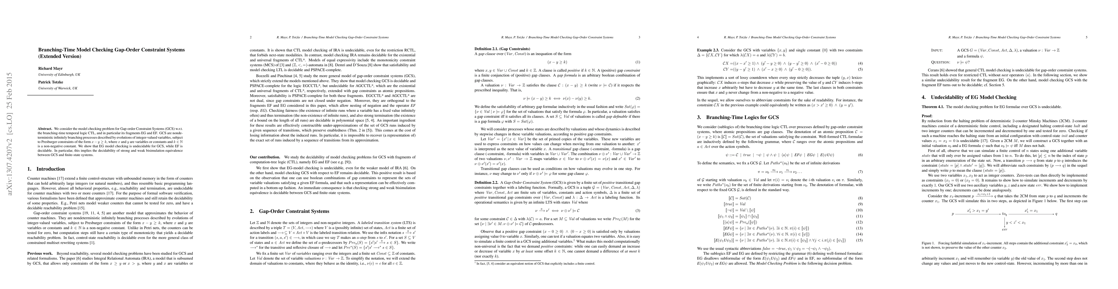 We consider the model checking problem for Gap-order Constraint Systems (GCS) w.r.t. the branching-time temporal logic CTL, and in particular its fragments EG and EF. GCS are nondeterministic infinitely branching processes described by evolutions of integer-valued variables, subject to Presburger constraints of the form $x-y\ge k$, where $x$ and $y$ are variables or constants and $k\in\mathbb{N}$ is a non-negative constant. We show that EG model checking is undecidable for GCS, while EF is decidable. In particular, this implies the decidability of strong and weak bisimulation equivalence between GCS and finite-state systems.