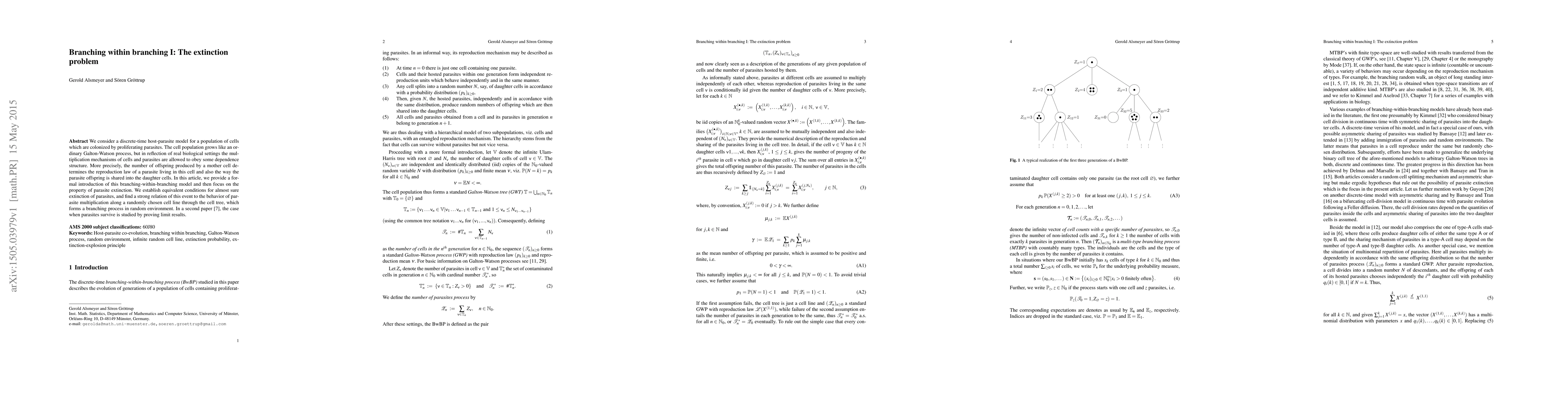 This paper introduces a discrete-time host-parasite model where cell and parasite populations follow a branching-within-branching process. It focuses on the conditions for parasite extinction, establishing a strong link between parasite multiplication and the extinction event.