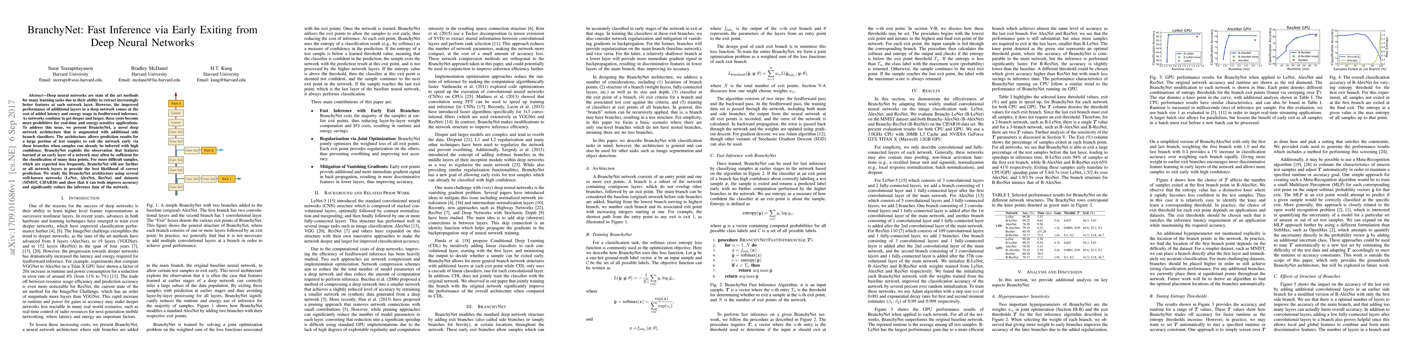 Deep neural networks are state of the art methods for many learning tasks due to their ability to extract increasingly better features at each network layer. However, the improved performance of additional layers in a deep network comes at the cost of added latency and energy usage in feedforward inference. As networks continue to get deeper and larger, these costs become more prohibitive for real-time and energy-sensitive applications. To address this issue, we present BranchyNet, a novel deep network architecture that is augmented with additional side branch classifiers. The architecture allows prediction results for a large portion of test samples to exit the network early via these branches when samples can already be inferred with high confidence. BranchyNet exploits the observation that features learned at an early layer of a network may often be sufficient for the classification of many data points. For more difficult samples, which are expected less frequently, BranchyNet will use further or all network layers to provide the best likelihood of correct prediction. We study the BranchyNet architecture using several well-known networks (LeNet, AlexNet, ResNet) and datasets (MNIST, CIFAR10) and show that it can both improve accuracy and significantly reduce the inference time of the network.