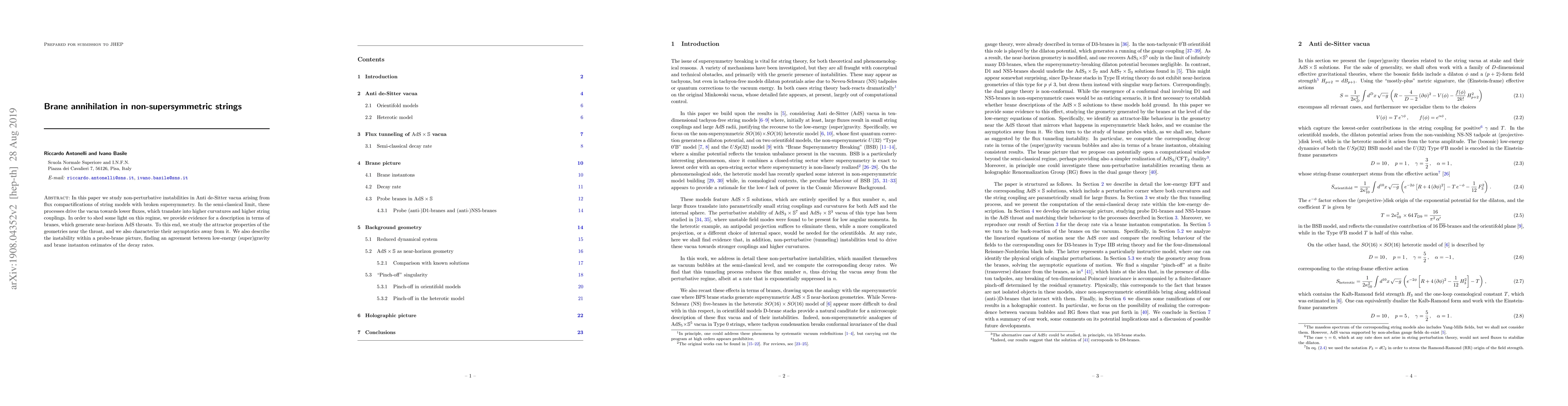 In this paper we study non-perturbative instabilities in Anti de-Sitter vacua arising from flux compactifications of string models with broken supersymmetry. In the semi-classical limit, these processes drive the vacua towards lower fluxes, which translate into higher curvatures and higher string couplings. In order to shed some light on this regime, we provide evidence for a description in terms of branes, which generate near-horizon AdS throats. To this end, we study the attractor properties of the geometries near the throat, and we also characterize their asymptotics away from it. We also describe the instability within a probe-brane picture, finding an agreement between low-energy (super)gravity and brane instanton estimates of the decay rates.