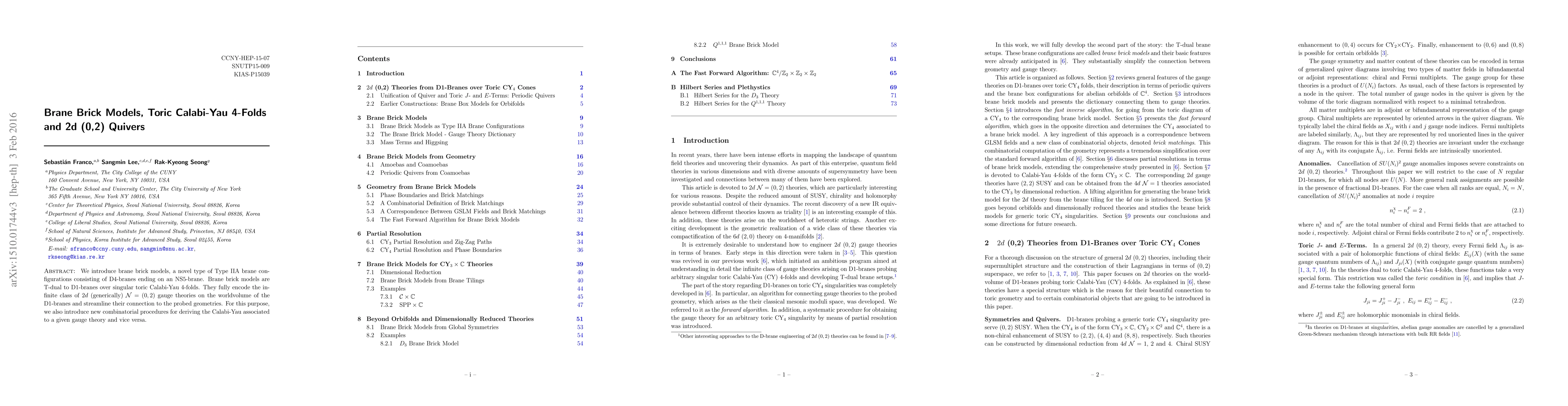 Summary: This paper presents brane brick models, a new type of Type IIA brane configuration, which are T-dual to D1-branes over singular toric Calabi-Yau 4-folds, and encode 2d (0,2) gauge theories. It also introduces combinatorial methods to derive the associated Calabi-Yau from a given gauge theory and vice versa.
