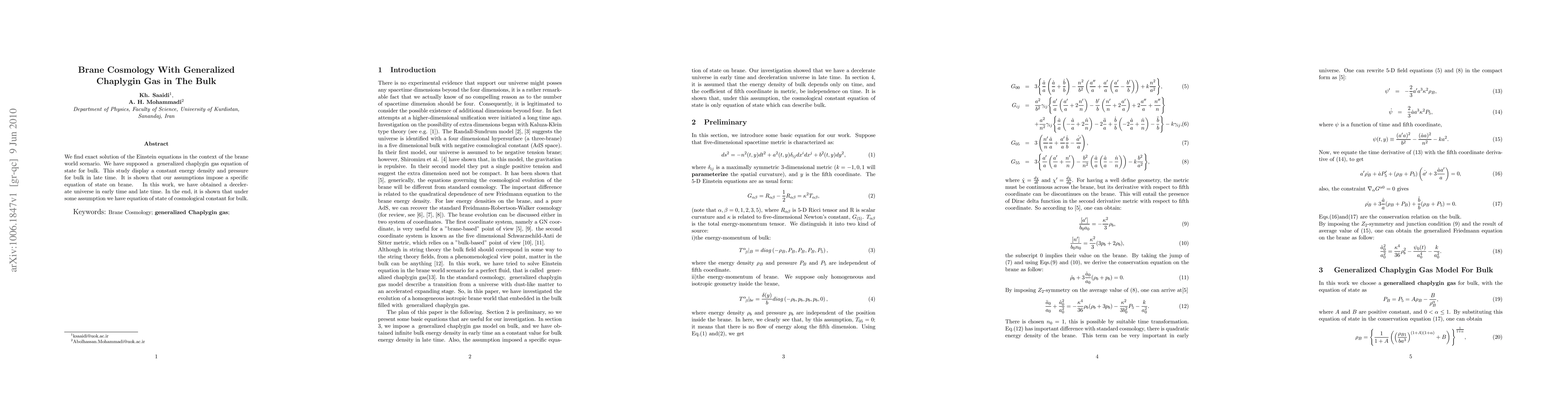 The paper presents a detailed derivation of the field equations and their solutions for brane cosmology with a generalized Chaplygin gas in the bulk, leading to a cosmological constant-like equation of state in late time.