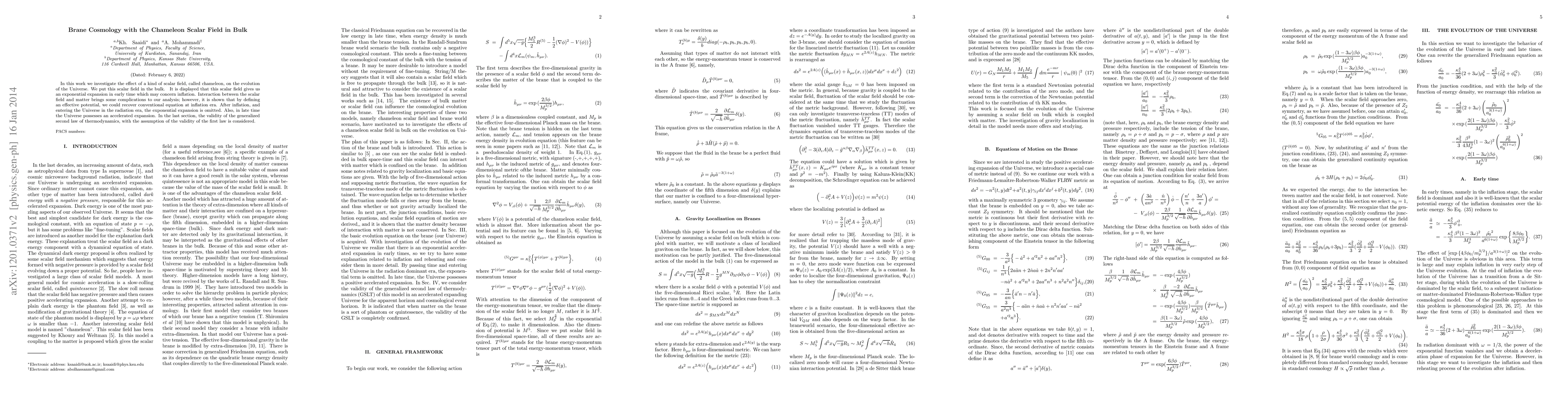 In this work we investigate the effect of a kind of scalar field, called chameleon, on the evolution of universe. We put this scalar field in the bulk. It is displayed that this scalar field gives us an exponential expansion in early time which may concern inflation. Interaction between scalar field and matter bring some complications in our analysis, however it is shown that by defining an effective potential, we could recover conventional equation at inflation era. After inflation, and entering the universe in radiation era, the exponential expansion is omitted. Also, in late time the universe possess an accelerated expansion. In the last section, the validity of generalized second law of thermodynamic, with assumption the validity of first law is considered.