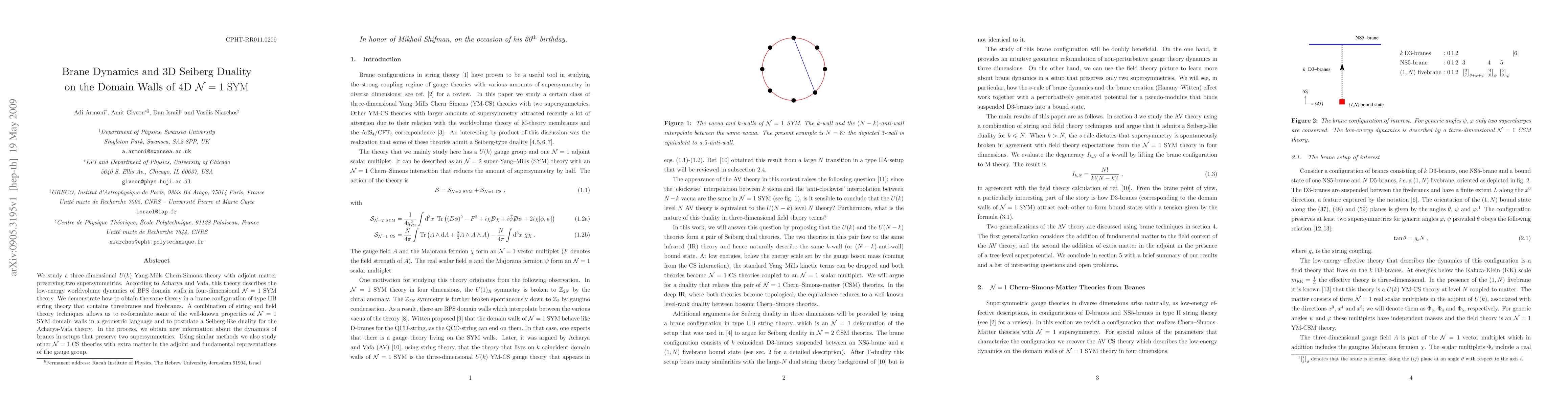 We study a three-dimensional U(k) Yang-Mills Chern-Simons theory with adjoint matter preserving two supersymmetries. According to Acharya and Vafa, this theory describes the low-energy worldvolume dynamics of BPS domain walls in four-dimensional N=1 SYM theory. We demonstrate how to obtain the same theory in a brane configuration of type IIB string theory that contains threebranes and fivebranes. A combination of string and field theory techniques allows us to re-formulate some of the well-known properties of N=1 SYM domain walls in a geometric language and to postulate a Seiberg-like duality for the Acharya-Vafa theory. In the process, we obtain new information about the dynamics of branes in setups that preserve two supersymmetries. Using similar methods we also study other N=1 CS theories with extra matter in the adjoint and fundamental representations of the gauge group.