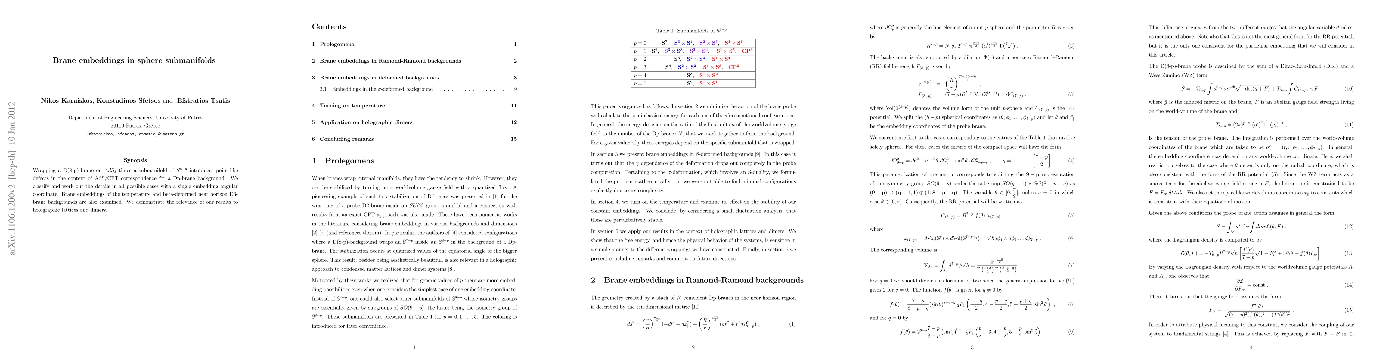 This paper classifies brane embeddings in sphere submanifolds within AdS/CFT contexts, focusing on D(8-p)-branes wrapped around AdS_2 and S^{8-p}. It also explores temperature and beta-deformations in near-horizon D3-brane backgrounds, with implications for holographic lattices and dimers.