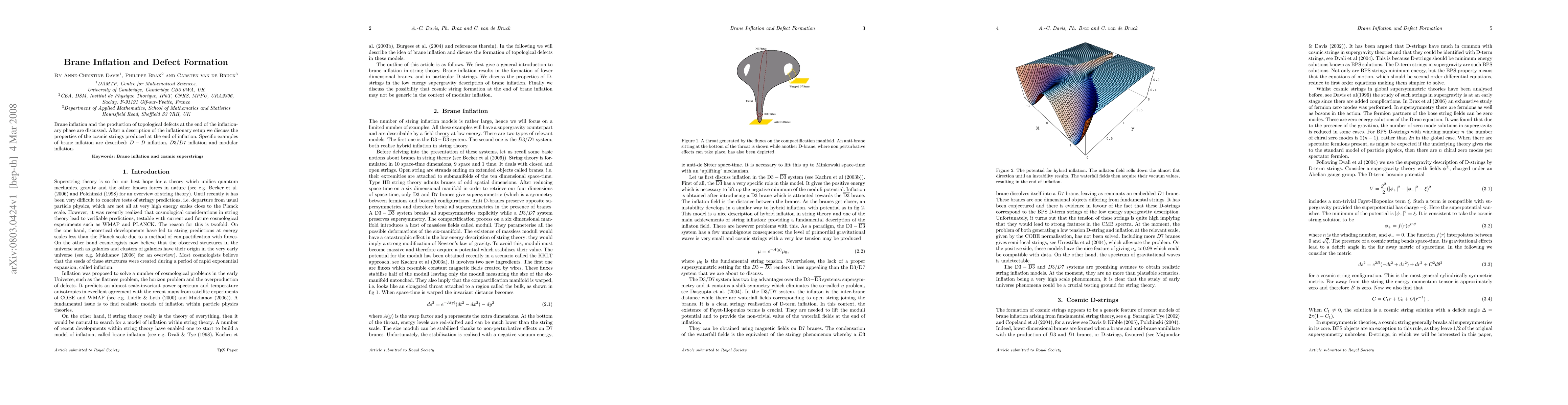 This paper explores brane inflation scenarios and the resulting formation of cosmic strings as topological defects. It examines $D-\bar D$ inflation, $D3/D7$ inflation, and modular inflation, detailing the characteristics of the strings generated post-inflation.