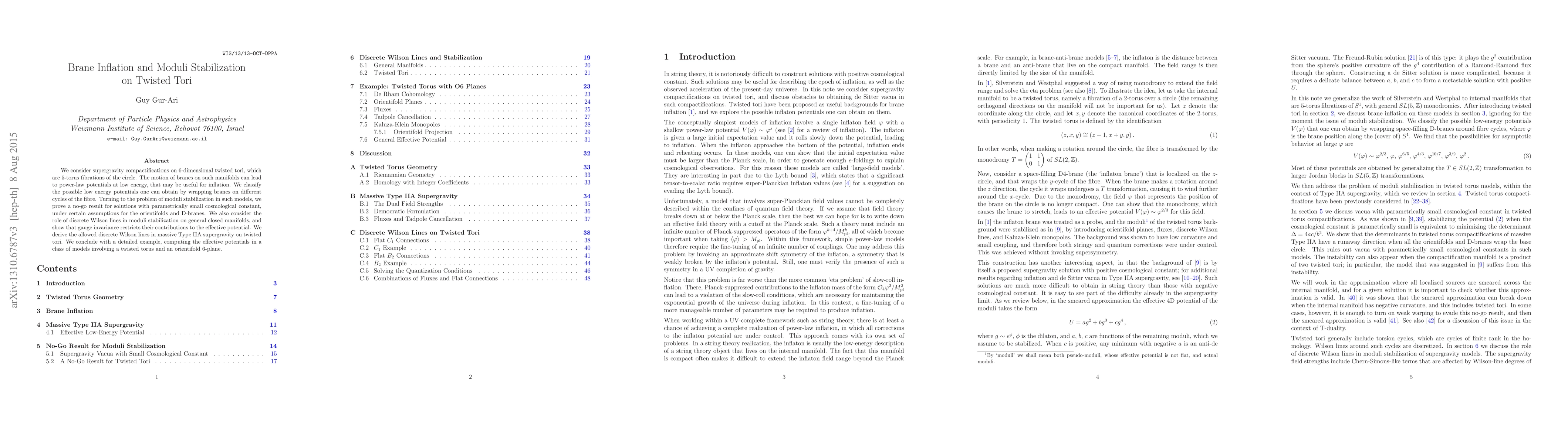 This paper explores supergravity compactifications on 6-dimensional twisted tori, focusing on brane motion that generates potentials for inflation and moduli stabilization. It finds no solutions for small cosmological constants under certain conditions and discusses the role of discrete Wilson lines in stabilizing moduli.