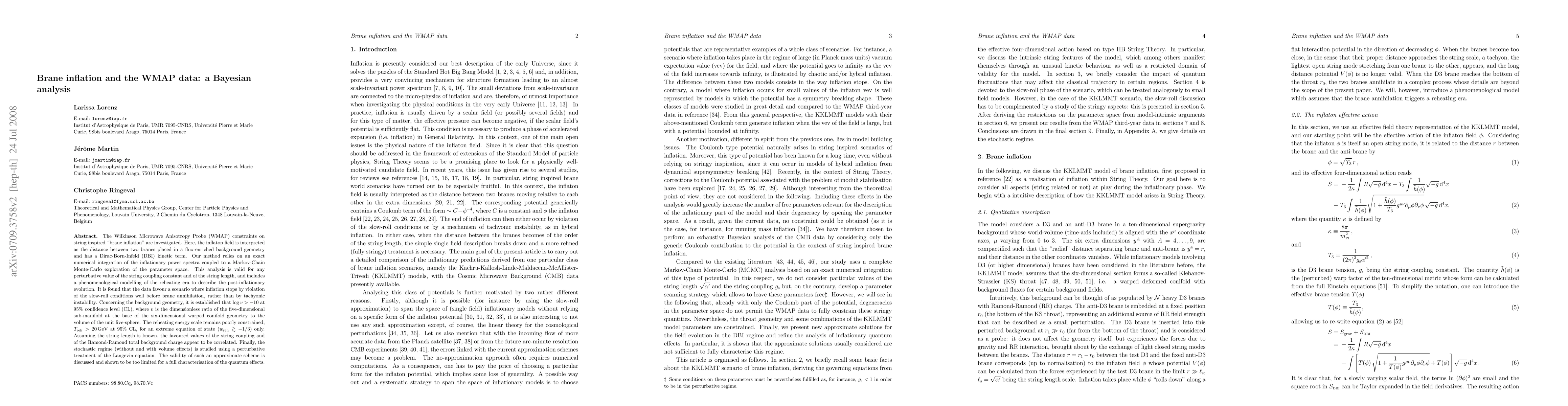 The Wilkinson Microwave Anisotropy Probe (WMAP) constraints on string inspired ''brane inflation'' are investigated. Here, the inflaton field is interpreted as the distance between two branes placed in a flux-enriched background geometry and has a Dirac-Born-Infeld (DBI) kinetic term. Our method relies on an exact numerical integration of the inflationary power spectra coupled to a Markov-Chain Monte-Carlo exploration of the parameter space. This analysis is valid for any perturbative value of the string coupling constant and of the string length, and includes a phenomenological modelling of the reheating era to describe the post-inflationary evolution. It is found that the data favour a scenario where inflation stops by violation of the slow-roll conditions well before brane annihilation, rather than by tachyonic instability. Concerning the background geometry, it is established that log(v) > -10 at 95% confidence level (CL), where "v" is the dimensionless ratio of the five-dimensional sub-manifold at the base of the six-dimensional warped conifold geometry to the volume of the unit five-sphere. The reheating energy scale remains poorly constrained, Treh > 20 GeV at 95% CL, for an extreme equation of state (wreh ~ -1/3) only. Assuming the string length is known, the favoured values of the string coupling and of the Ramond-Ramond total background charge appear to be correlated. Finally, the stochastic regime (without and with volume effects) is studied using a perturbative treatment of the Langevin equation. The validity of such an approximate scheme is discussed and shown to be too limited for a full characterisation of the quantum effects.