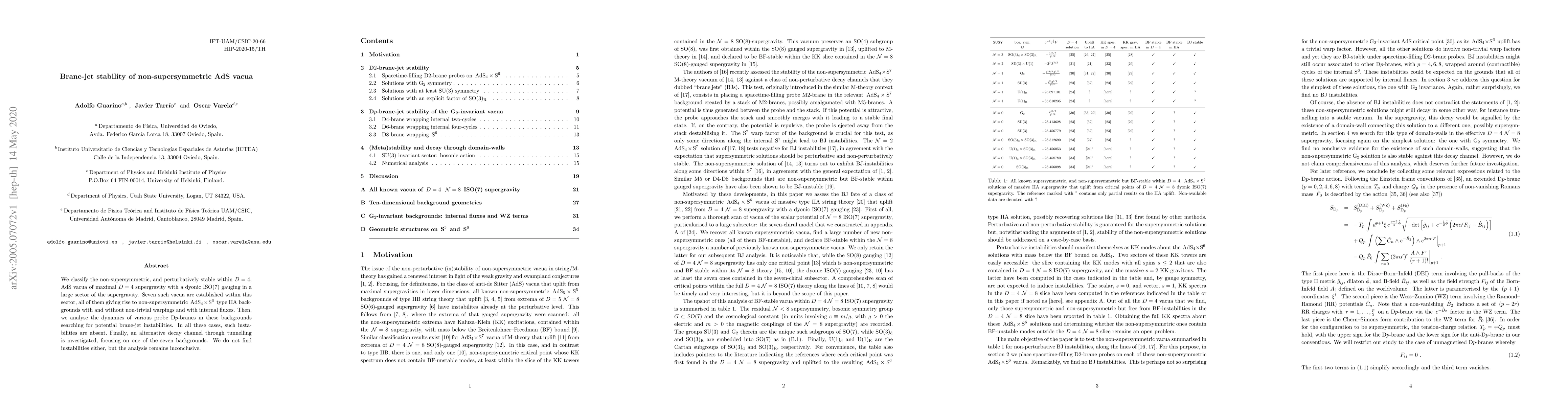This paper classifies seven perturbatively stable, non-supersymmetric AdS vacua in maximal $D=4$ supergravity, analyzing the stability of probe D$p$-branes against brane-jet instabilities, which are found to be absent. An investigation into potential alternative decay channels through tunnelling also finds no instabilities, though the analysis is inconclusive.