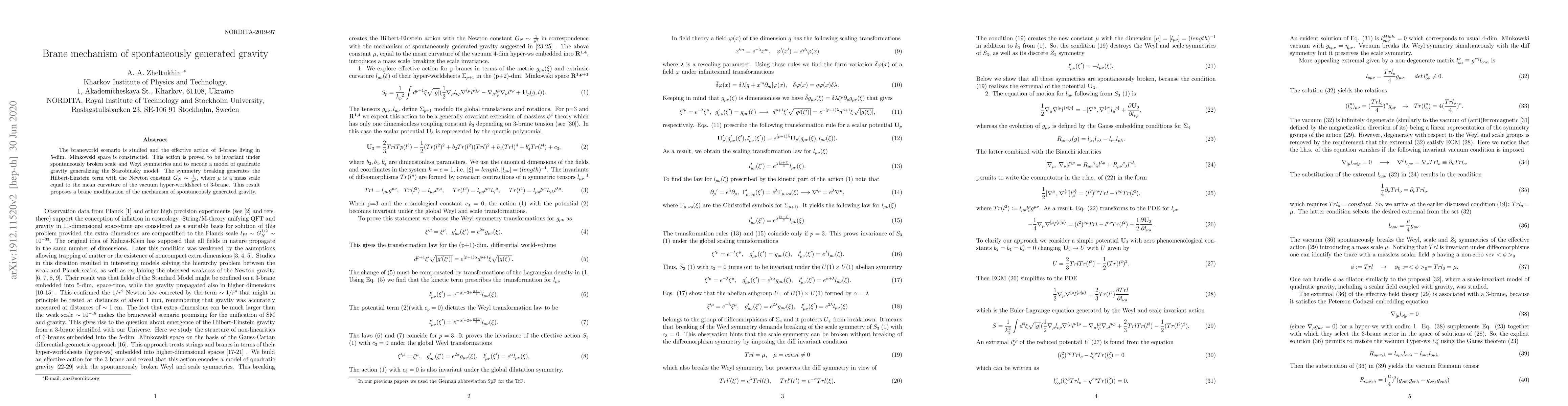 The braneworld scenario is studied and the effective action of 3-brane living in 5-dim. Minkowski space is constructed. This action is proved to be invariant under spontaneously broken scale and Weyl symmetries and to encode a model of quadratic gravity generalizing the Starobinsky model. The symmetry breaking generates the Hilbert-Einstein term with the Newton constant $G_{N}\sim\frac{1}{\mu^{2}}$, where $\mu$ is a mass scale equal to the mean curvature of the vacuum hyper-worldsheet of 3-brane. This result proposes a brane modification of the mechanism of spontaneously generated gravity.