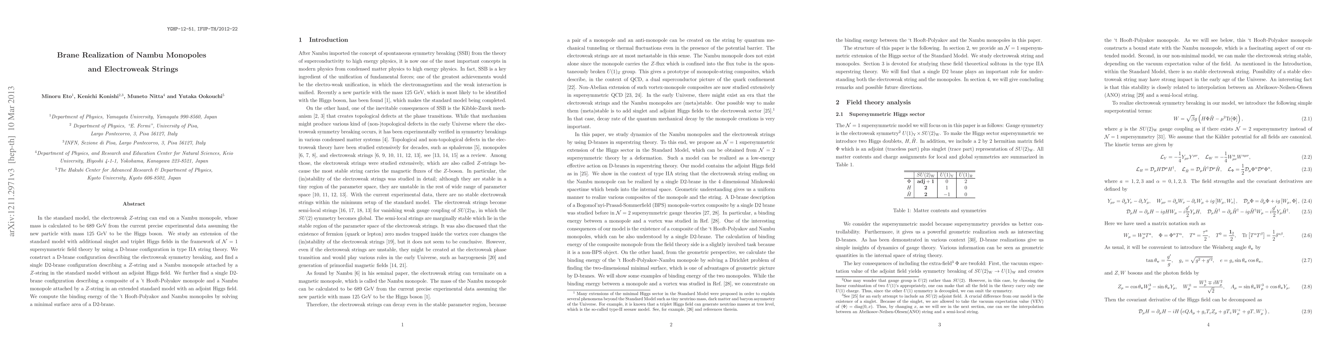 In the standard model, the electroweak Z-string can end on a Nambu monopole, whose mass is calculated to be 689 GeV from the current precise experimental data assuming the new particle with mass 125 GeV to be the Higgs boson. We study an extension of the standard model with additional singlet and triplet Higgs fields in the framework of N=1 supersymmetric field theory by using a D-brane configuration in type IIA string theory. We construct a D-brane configuration describing the electroweak symmetry breaking, and find a single D2-brane configuration describing a Z-string and a Nambu monopole attached by a Z-string in the standard model without an adjoint Higgs field. We further find a single D2-brane configuration describing a composite of a 't Hooft-Polyakov monopole and a Nambu monopole attached by a Z-string in an extended standard model with an adjoint Higgs field. We compute the binding energy of the 't Hooft-Polyakov and Nambu monopoles by solving a minimal surface area of a D2-brane.