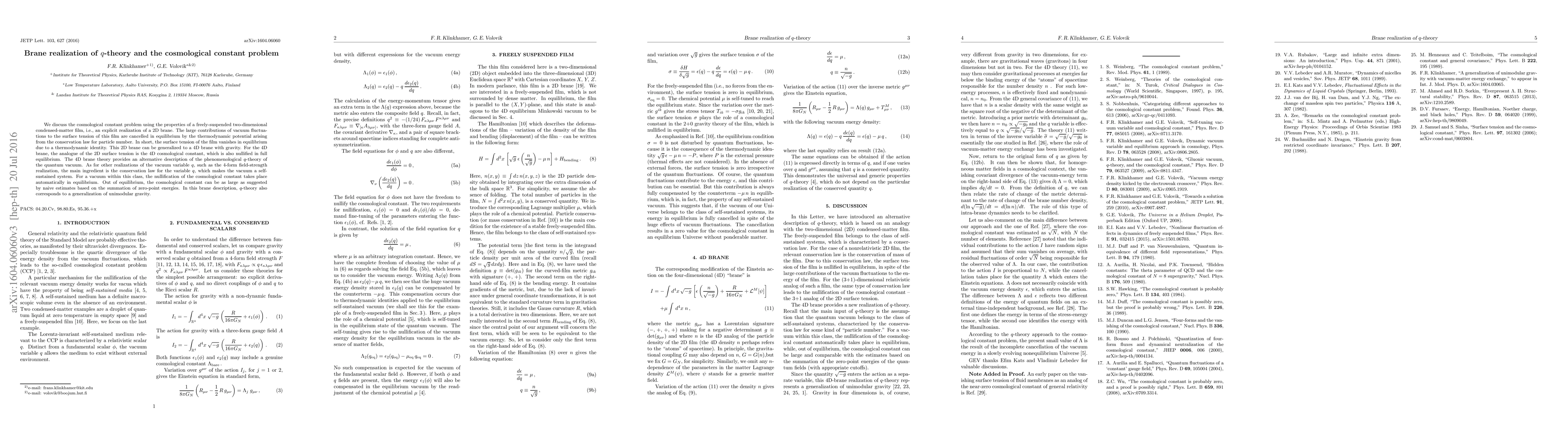 We discuss the cosmological constant problem using the properties of a freely-suspended two-dimensional condensed-matter film, i.e., an explicit realization of a 2D brane. The large contributions of vacuum fluctuations to the surface tension of this film are cancelled in equilibrium by the thermodynamic potential arising from the conservation law for particle number. In short, the surface tension of the film vanishes in equilibrium due to a thermodynamic identity. This 2D brane can be generalized to a 4D brane with gravity. For the 4D brane, the analogue of the 2D surface tension is the 4D cosmological constant, which is also nullified in full equilibrium. The 4D brane theory provides an alternative description of the phenomenological $q$-theory of the quantum vacuum. As for other realizations of the vacuum variable $q$, such as the 4-form field-strength realization, the main ingredient is the conservation law for the variable $q$, which makes the vacuum a self-sustained system. For a vacuum within this class, the nullification of the cosmological constant takes place automatically in equilibrium. Out of equilibrium, the cosmological constant can be as large as suggested by naive estimates based on the summation of zero-point energies. In this brane description, $q$-theory also corresponds to a generalization of unimodular gravity.