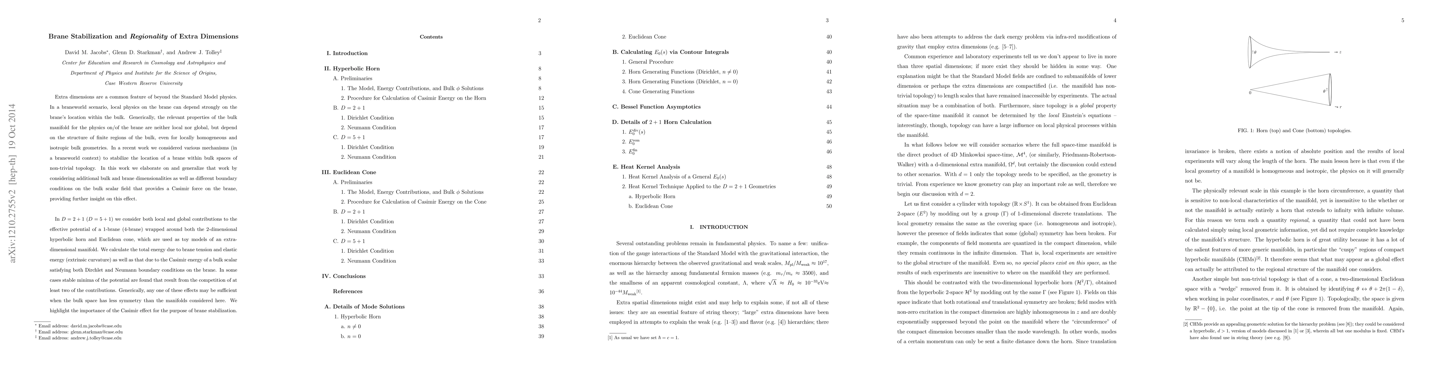 Extra dimensions are a common feature of beyond the Standard Model physics. In a braneworld scenario, local physics on the brane can depend strongly on the brane's location within the bulk. Generically, the relevant properties of the bulk manifold for the physics on/of the brane are neither local nor global, but depend on the structure of finite regions of the bulk, even for locally homogeneous and isotropic bulk geometries. In a recent work, various mechanisms (in a braneworld context) were considered to stabilize the location of a brane within bulk spaces of non-trivial topology. In this work we elaborate on and generalize that work by considering additional bulk and brane dimensionalities as well as different boundary conditions on the bulk scalar field that provides a Casimir force on the brane, providing further insight on this effect. In D=2+1 (D=5+1) we consider both local and global contributions to the effective potential of a 1-brane (4-brane) wrapped around both the 2-dimensional hyperbolic horn and Euclidean cone, which are used as toy models of an extra-dimensional manifold. We calculate the total energy due to brane tension and elastic energy (extrinsic curvature) as well as that due to the Casimir energy of a bulk scalar satisfying both Dirchlet and Neumann boundary conditions on the brane. In some cases stable minima of the potential are found that result from the competition of at least two of the contributions. Generically, any one of these effects may be sufficient when the bulk space has less symmetry than the manifolds considered here. We highlight the importance of the Casimir effect for the purpose of brane stabilization.
