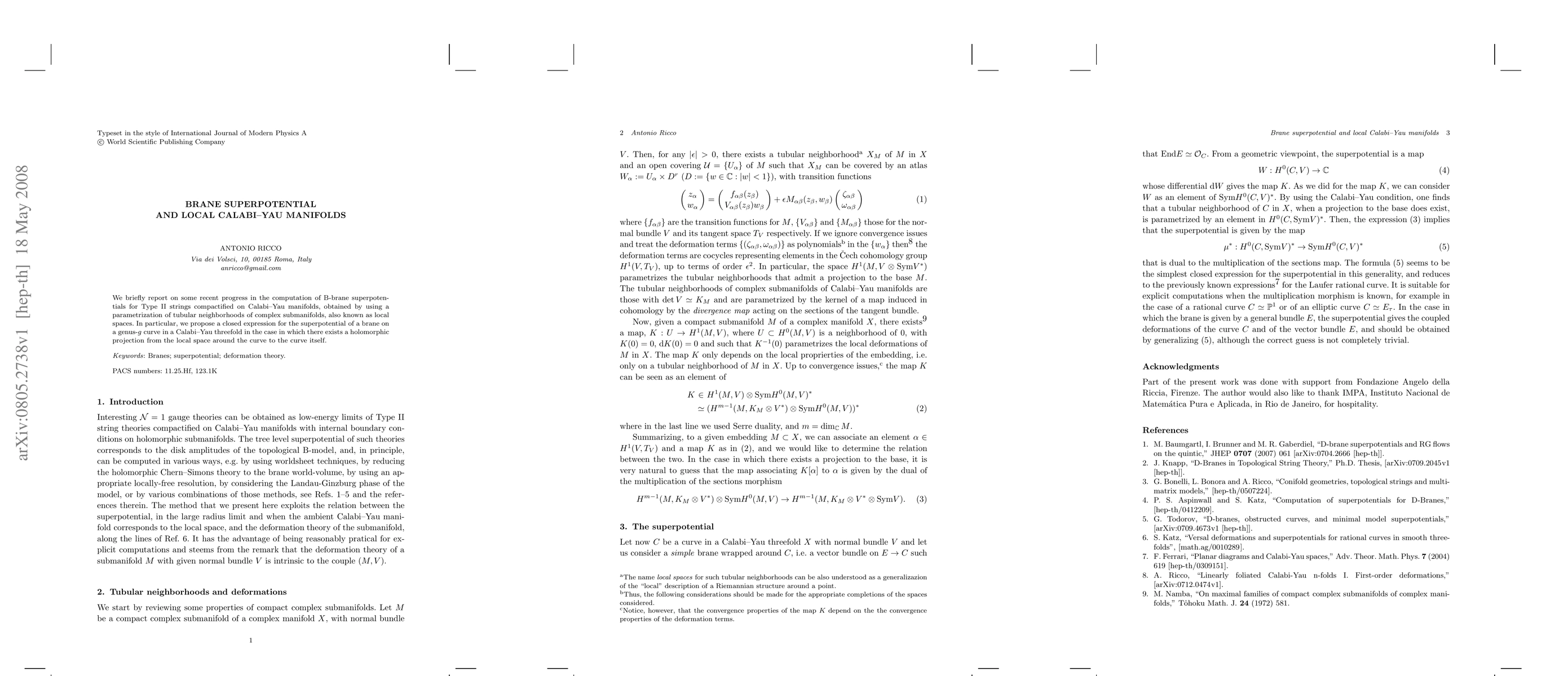 This paper discusses recent advancements in computing B-brane superpotentials for Type II strings on Calabi-Yau manifolds using tubular neighborhoods of complex submanifolds. It proposes a closed expression for the superpotential of a brane on a genus-g curve in a Calabi-Yau threefold under a holomorphic projection from the local space to the curve.