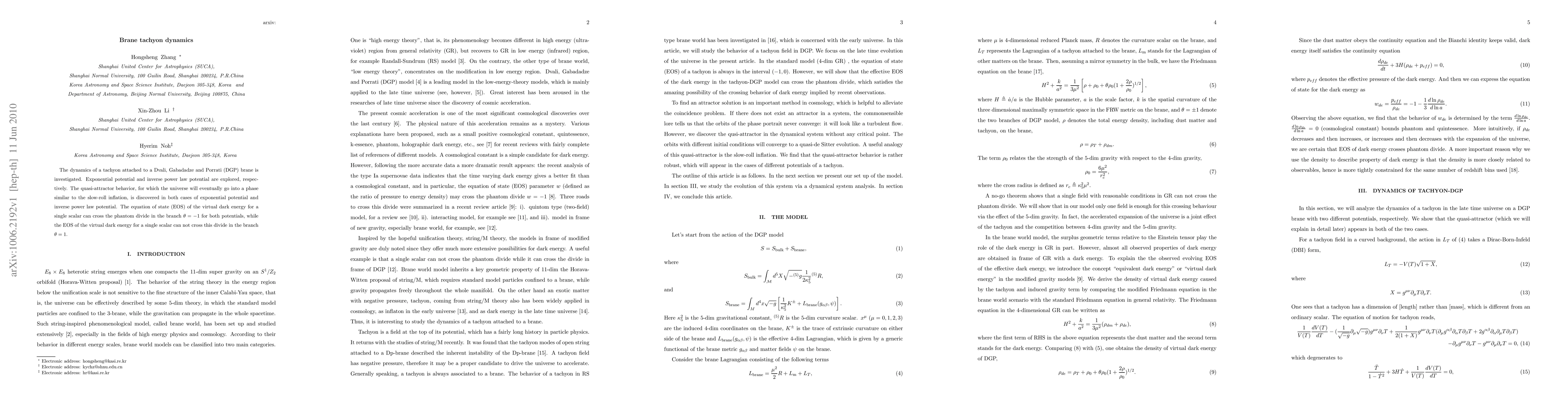 The dynamics of a tachyon attached to a Dvali, Gabadadze and Porrati (DGP) brane is investigated. Exponential potential and inverse power law potential are explored, respectively. The quasi-attractor behavior, for which the universe will eventually go into a phase similar to the slow-roll inflation, is discovered in both cases of exponential potential and inverse power law potential. The equation of state (EOS) of the virtual dark energy for a single scalar can cross the phantom divide in the branch $\theta=-1$ for both potentials, while the EOS of the virtual dark energy for a single scalar can not cross this divide in the branch $\theta=1$.