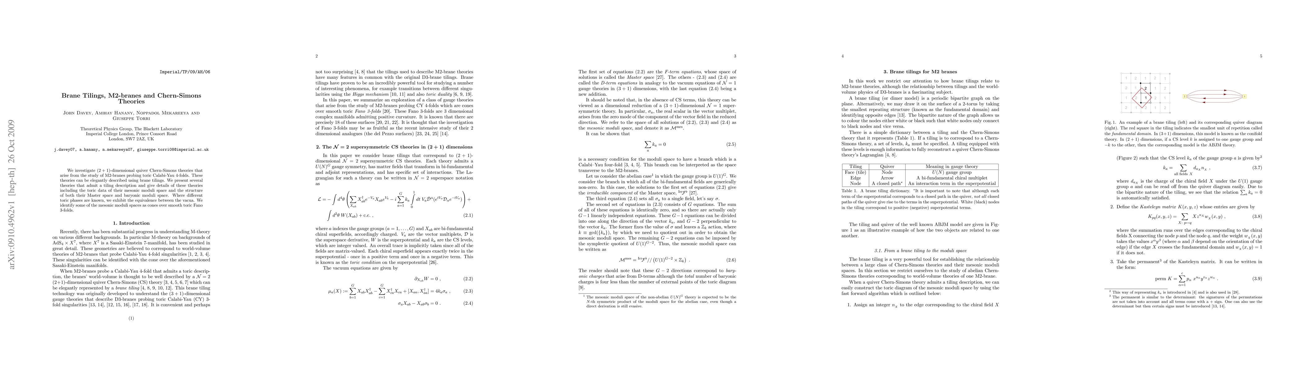 This paper explores (2+1)-dimensional quiver Chern-Simons theories derived from M2-branes on toric Calabi-Yau 4-folds, describing them through brane tilings. It details the toric data, Master space structure, and baryonic moduli space equivalences, identifying mesonic moduli spaces as cones over toric Fano 3-folds.