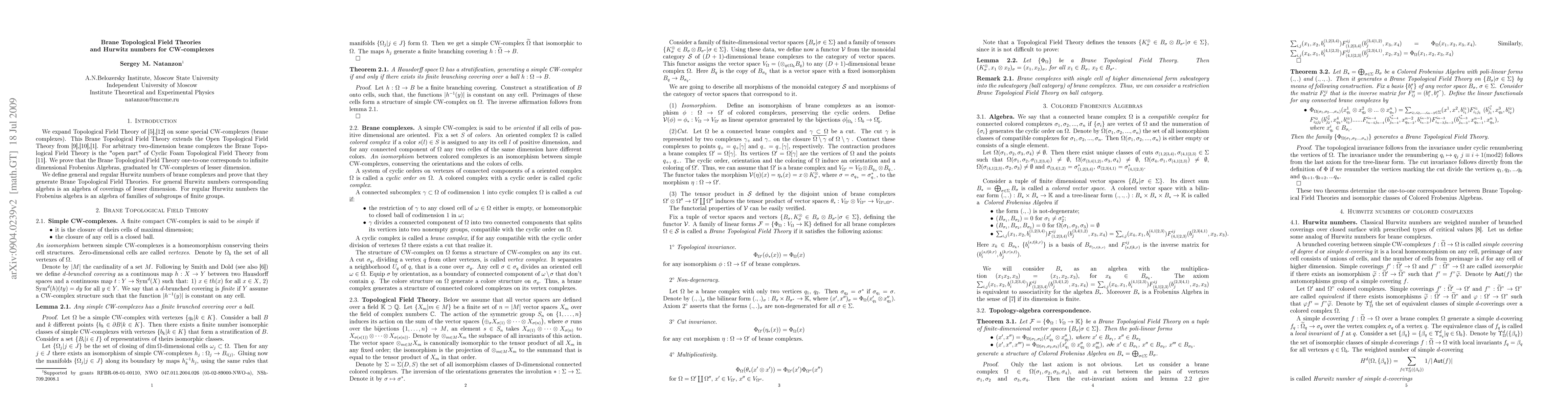 We expand Topological Field Theory on some special CW-complexes (brane complexes). This Brane Topological Field Theory one-to-one corresponds to infinite dimensional Frobenius Algebras, graduated by CW-complexes of lesser dimension. We define general and regular Hurwitz numbers of brane complexes and prove that they generate Brane Topological Field Theories. For general Hurwitz numbers corresponding algebra is an algebra of coverings of lesser dimension. For regular Hurwitz numbers the Frobenius algebra is an algebra of families of subgroups of finite groups.