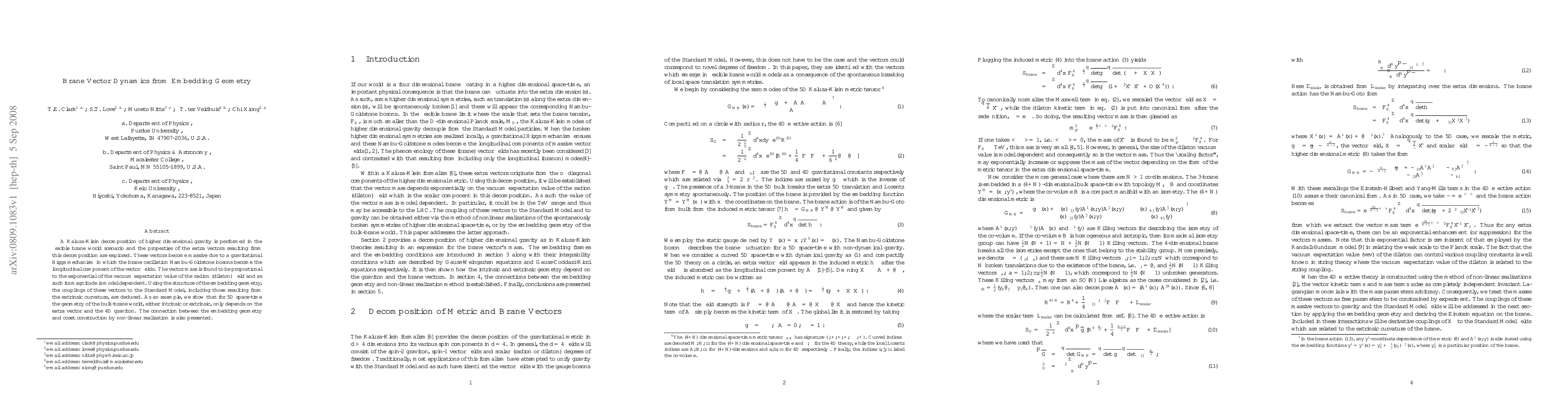 A Kaluza-Klein decomposition of higher dimensional gravity is performed in the flexible brane world scenario and the properties of the extra vectors resulting from this decomposition are explored. These vectors become massive due to a gravitational Higgs mechanism in which the brane oscillation Nambu-Goldstone bosons become the longitudinal component of the vector fields. The vector mass is found to be proportional to the exponential of the vacuum expectation value of the radion (dilaton) field and as such its magnitude is model dependent. Using the structure of the embedding geometry, the couplings of these vectors to the Standard Model, including those resulting from the extrinsic curvature, are deduced. As an example, we show that for 5D space-time the geometry of the bulk-brane world, either intrinsic or extrinsic, only depends on the extra vector and the 4D graviton. The connection between the embedding geometry and coset construction by non-linear realization is also presented.