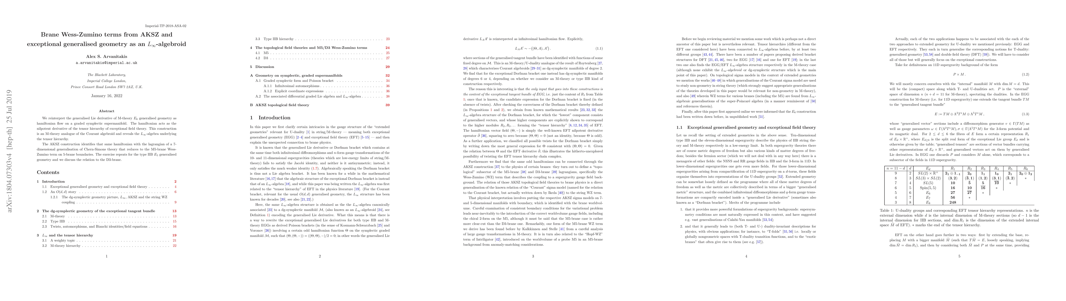 We reinterpret the generalised Lie derivative of M-theory $E_6$ generalised geometry as hamiltonian flow on a graded symplectic supermanifold. The hamiltonian acts as the nilpotent derivative of the tensor hierarchy of exceptional field theory. This construction is an M-theory analogue of the Courant algebroid and reveals the $L_\infty$-algebra underlying the tensor hierarchy. The AKSZ construction identifies that same hamiltonian with the lagrangian of a 7-dimensional generalisation of Chern-Simons theory that reduces to the M5-brane Wess-Zumino term on 5-brane boundaries. The exercise repeats for the type IIB $E_5$ generalised geometry and we discuss the relation to the D3-brane.