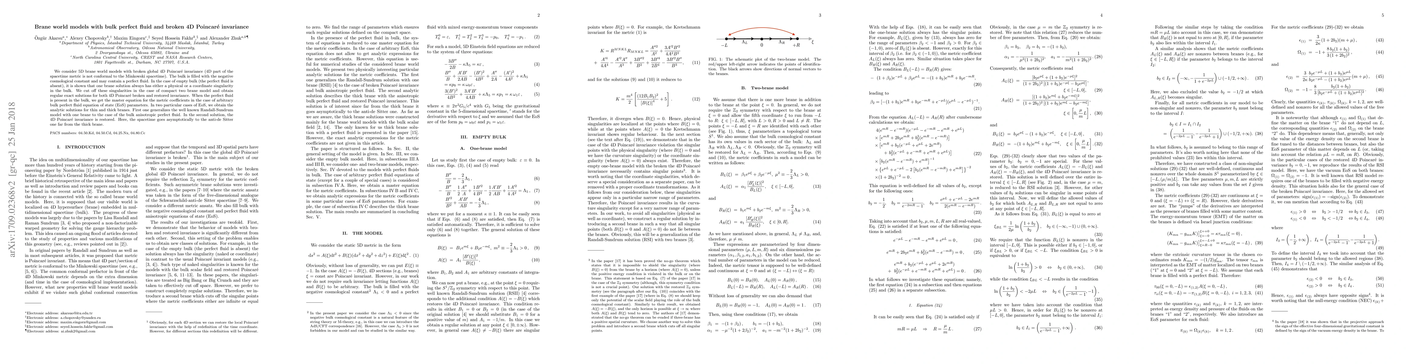This paper explores 5D brane world models with broken 4D Poincaré invariance and a bulk filled with a negative cosmological constant and/or a perfect fluid. It finds singularities in empty bulk models and resolves them in a compact two-brane setup, obtaining regular solutions. It also derives a master equation for the metric coefficients with an arbitrary perfect fluid equation of state and provides analytic solutions for thin and thick branes.