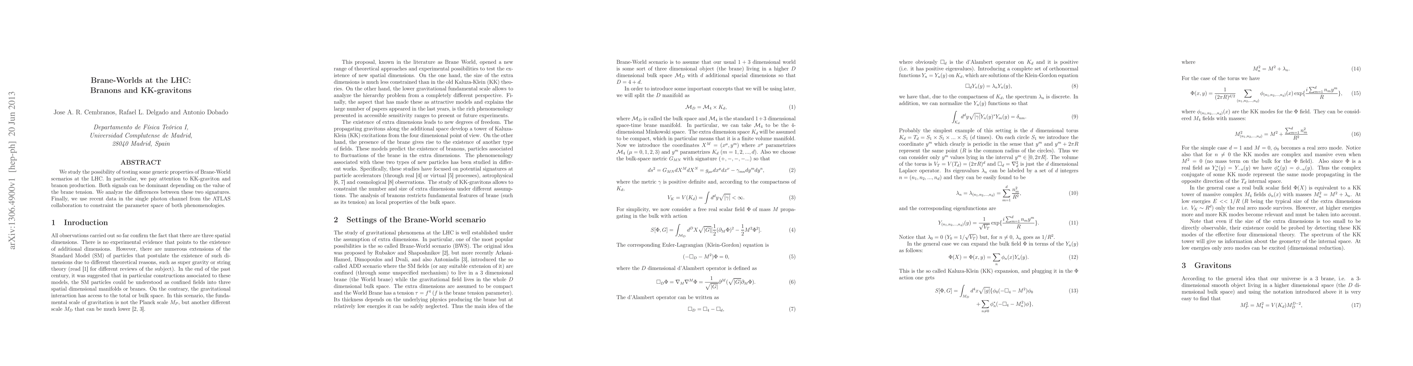 We study the possibility of testing some generic properties of Brane-World scenarios at the LHC. In particular, we pay attention to KK-graviton and branon production. Both signals can be dominant depending on the value of the brane tension. We analyze the differences between these two signatures. Finally, we use recent data in the single photon channel from the ATLAS collaboration to constraint the parameter space of both phenomenologies.
